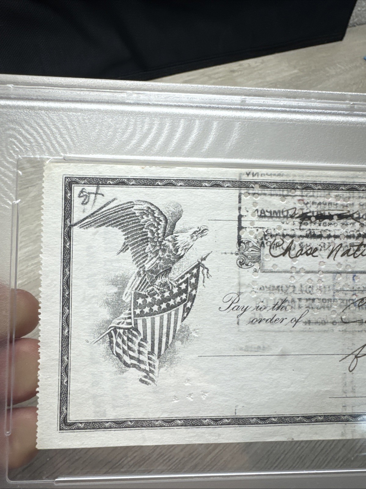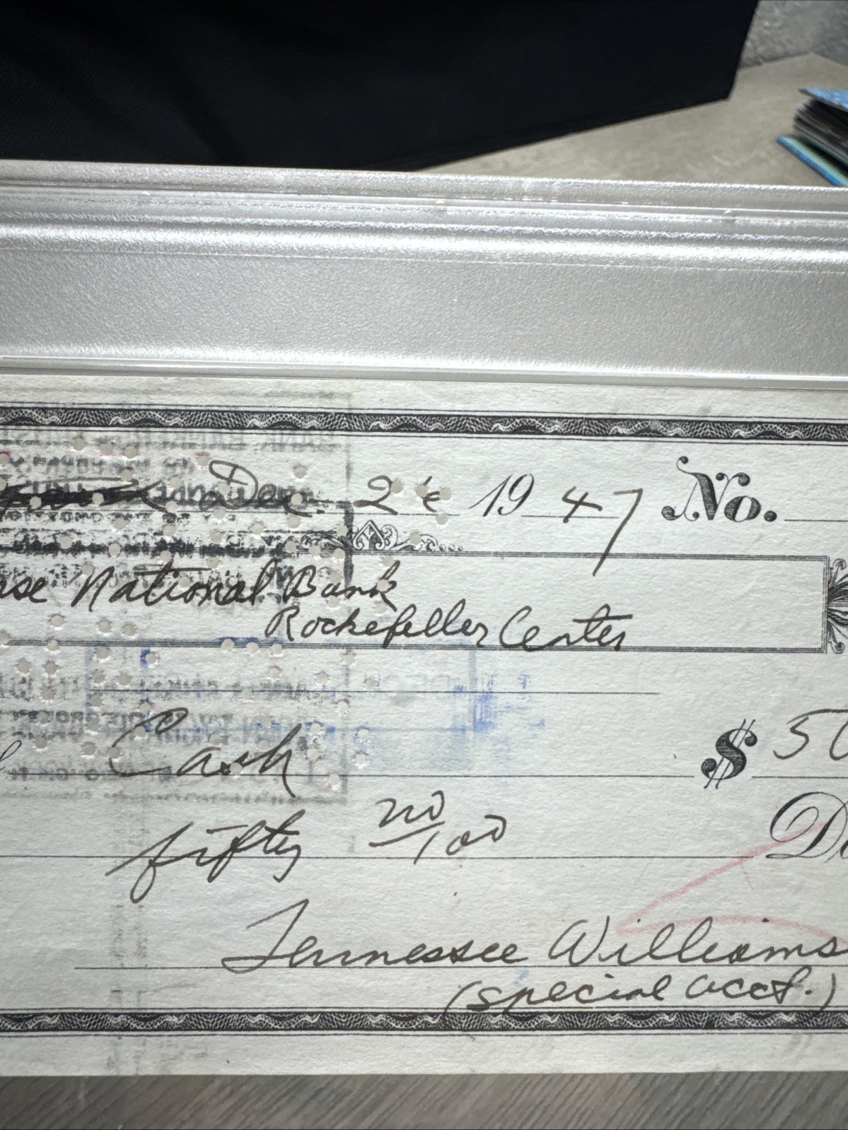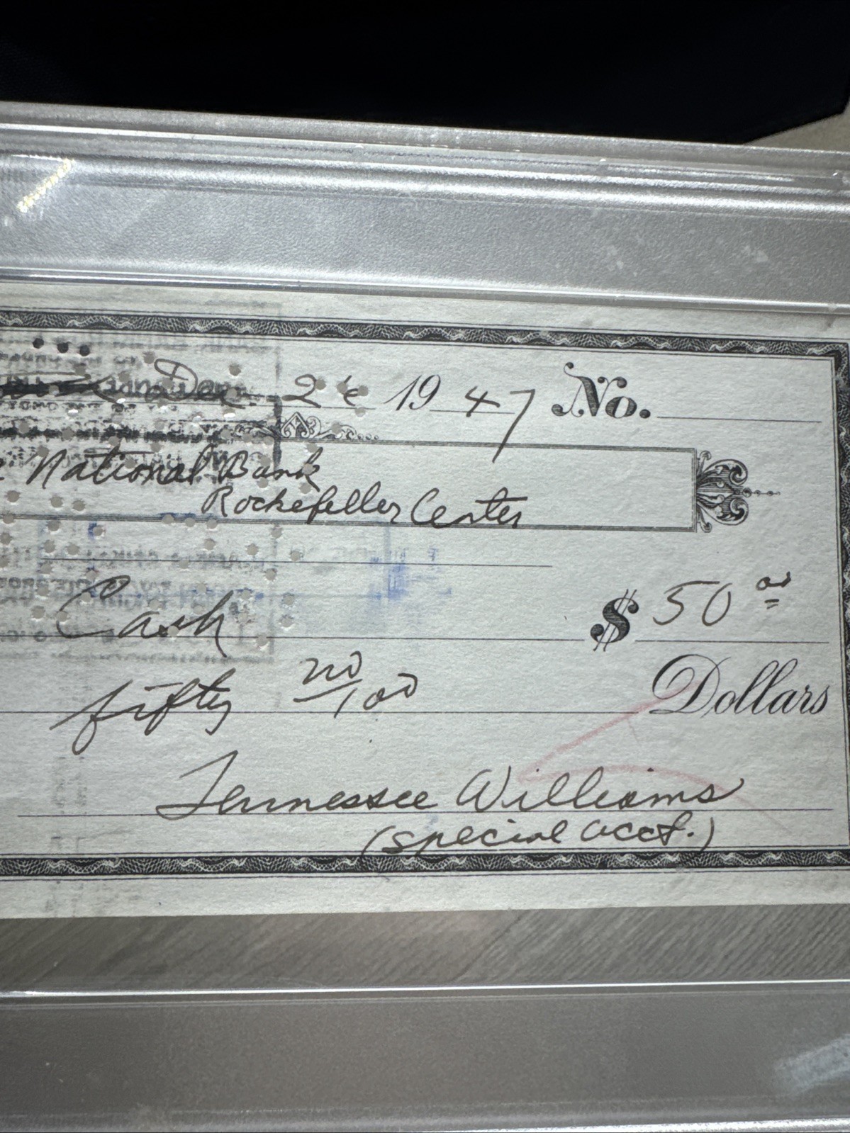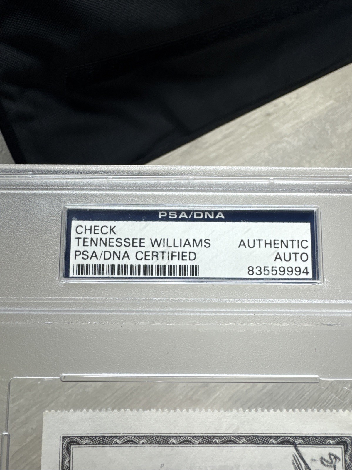 Dec 26th, 1947 cancelled check from Chase national Bank in Rockefeller Center. Drawn on the personal account of Tennessee Williams and signed by the famous playwright. Encapsulated and authenticated by PSA/DNA.