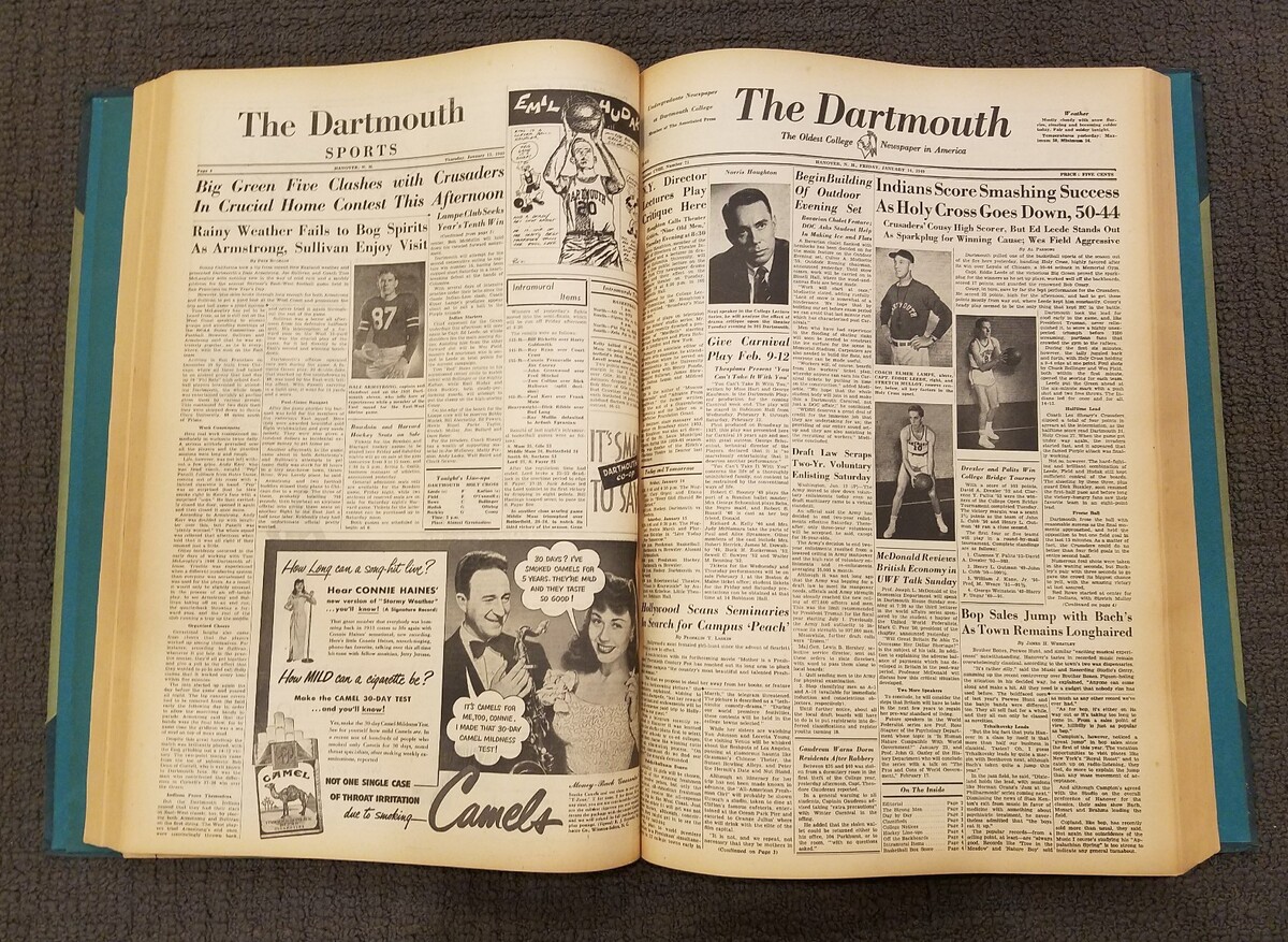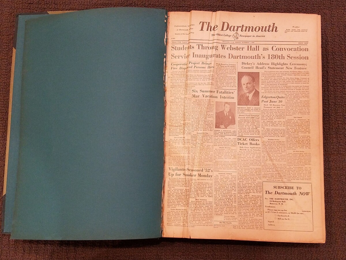 In vendita sono i giornali rilegati del Dartmouth College per l'anno scolastico 1948-1949 in un libro rilegato con copertina verde. Il primo giornale e del 1 ottobre 1948 e l'ultimo giornale e l'edizione iniziale dell'11 giugno 1949.