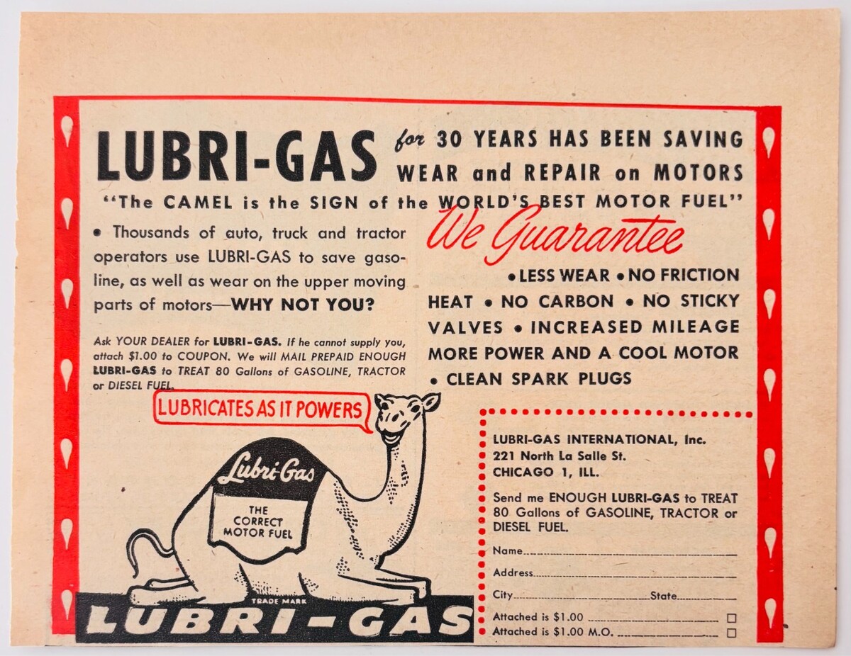 - 1948 Lubri-Gas Motor Fuel Advertisement Automobilia Oil Lubrication Camel F17L