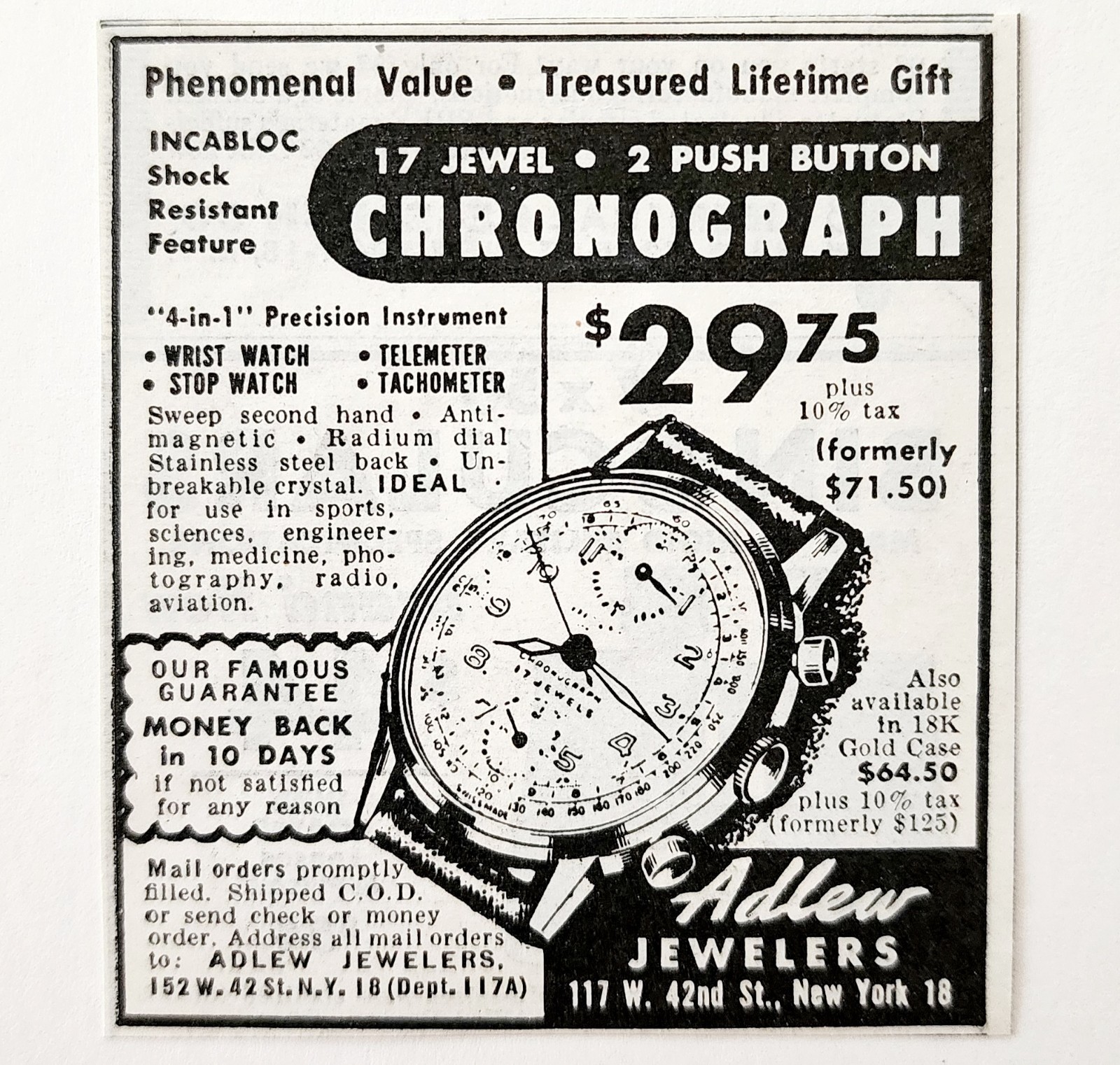 - 1949 Adlew Jewelers Chronograph Watch Advertisement New York City Jewelry E8Q