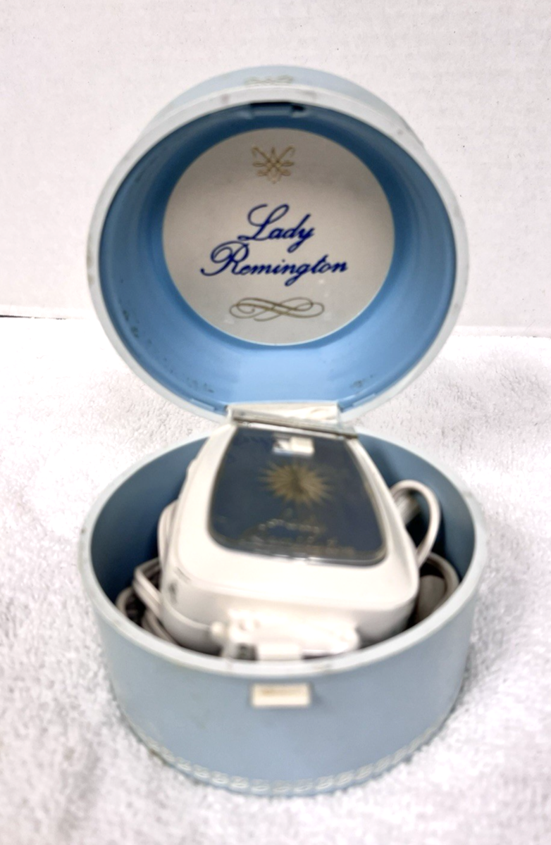 1950s Lady Remington Electric Shaver in Pale Blue White Box Works The case is solid and unbroken however it has yellowing spots (it kind of looks like soap?)
