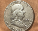 The 1953 P Franklin Half Dollar is a circulated coin with a denomination of 50 cents. Made of 90% silver, this business strike coin was minted in Philadelphia. Uncertified and ungraded, this United States coin features the iconic image of Benjamin Franklin on the obverse. A valuable addition to any coin collection, this piece of US currency represents a historic moment in American numismatics.