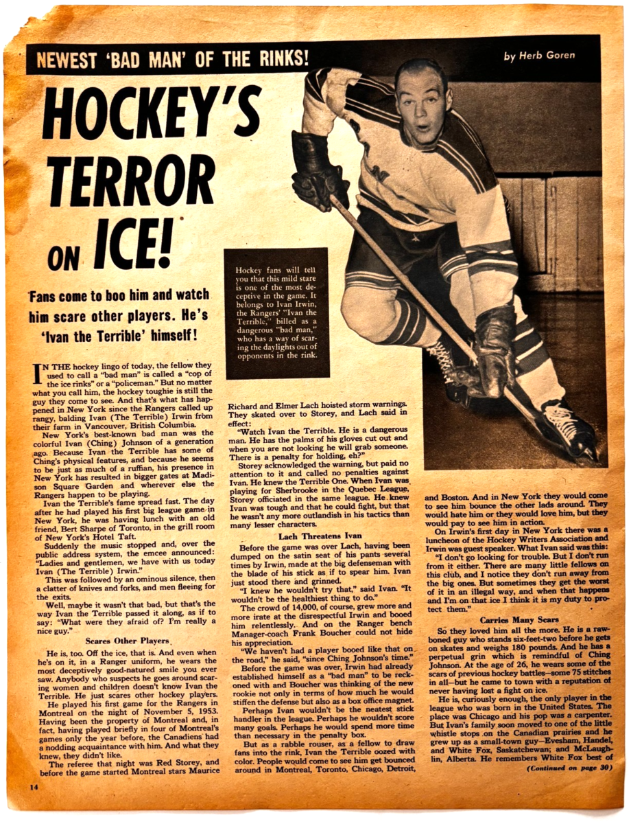 1954 Ivan The Terrible Irwin NHL Hockey Terror Article New York Rangers DWXX5