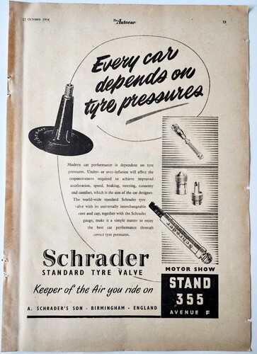 - 1954 Schrader Tire Valve Earls Court Motor Show Advertisement Automobilia DWPP11