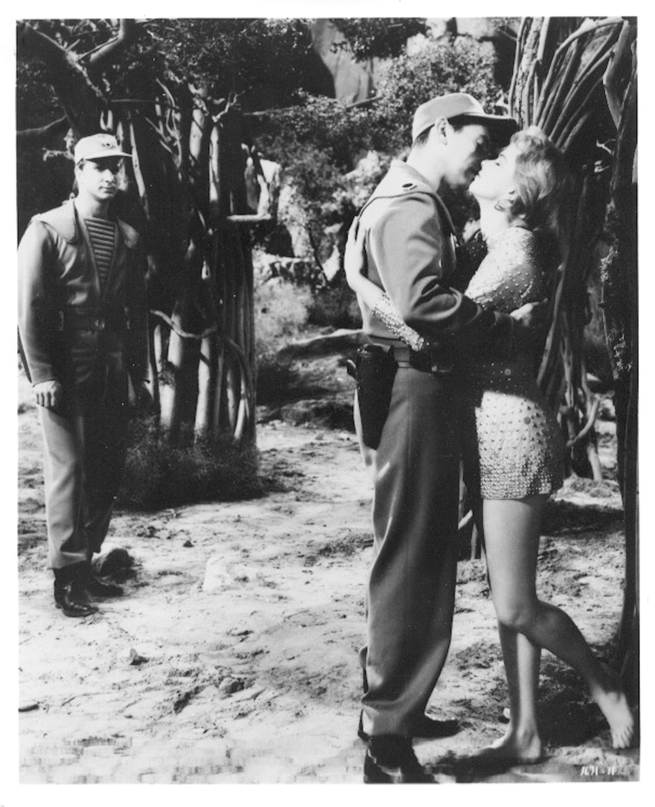 Commander Adams (Leslie Nielsen) catches Jack Kelly’s Lt. Farman kissing Altaira (Anne Francis) in this advantage taking scene still from the 1956 sci-fi classic.