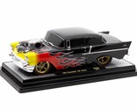 Brand new 1/24 scale diecast car model of 1957 Chevrolet 150 Sedan Black with Flames Graphics Limited Edition to 4250 pieces Worldwide die cast model car by M2 Machines. Brand new box. Real rubber tires. Has opening hood. True-to-scale detail. Has steerable wheels. Officially licensed product. Manufacturer's original unopened packaging. Made of diecast metal with some plastic parts. Detailed interior, exterior, engine compartment. Dimensions approximately L-8.25, W-3.25, H-2.25 inches.