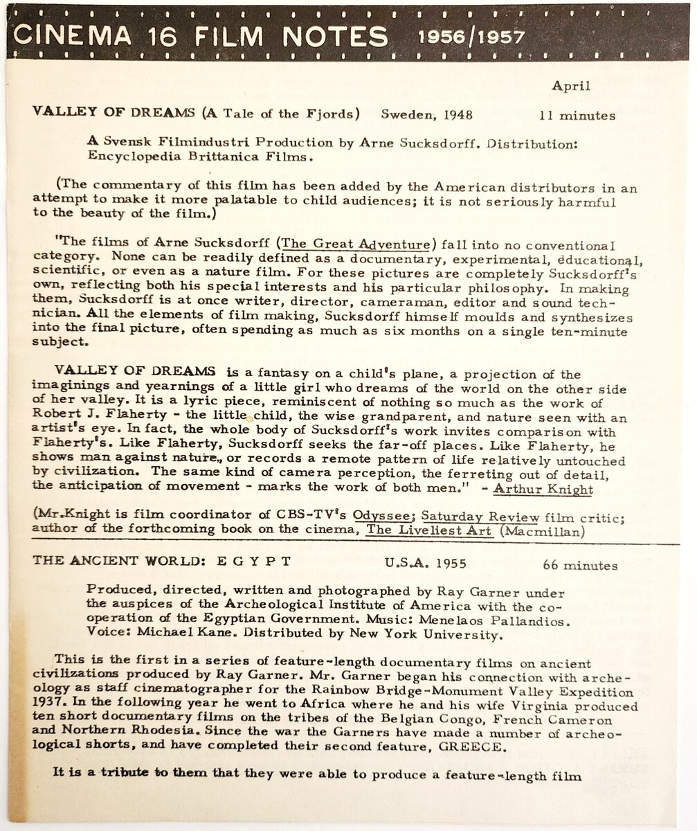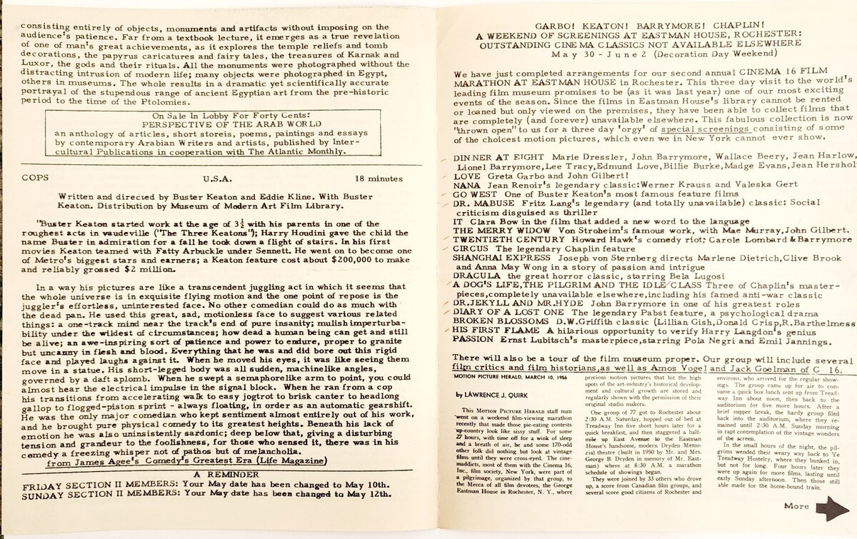 - 1957 Cinema 16 Film Notes Valley Of Dreams Cops Buster Keaton Original C99