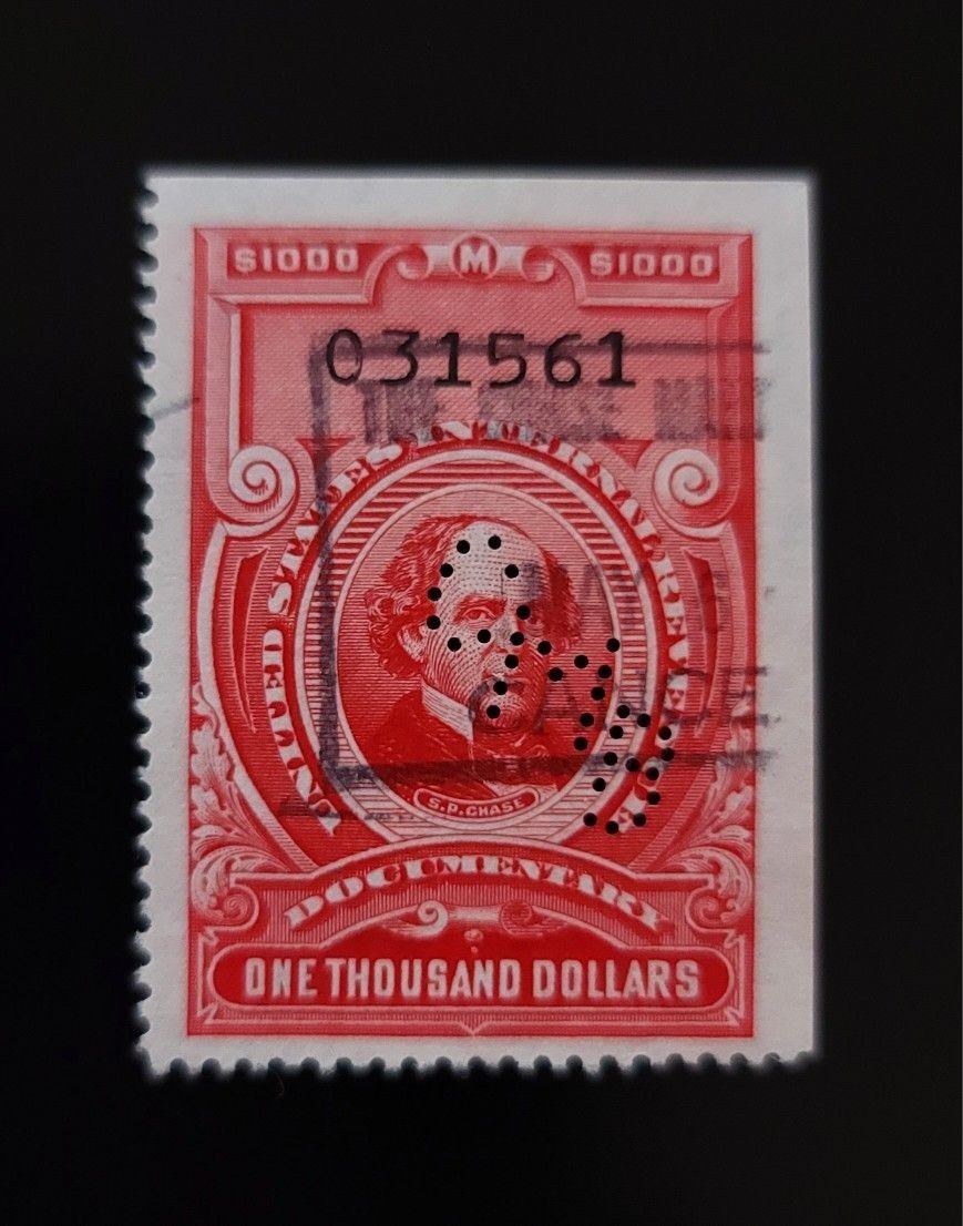 - 1958 $1000 U.S. Internal Revenue, Documentary, S. P. Chase, R729, Carmine 031561