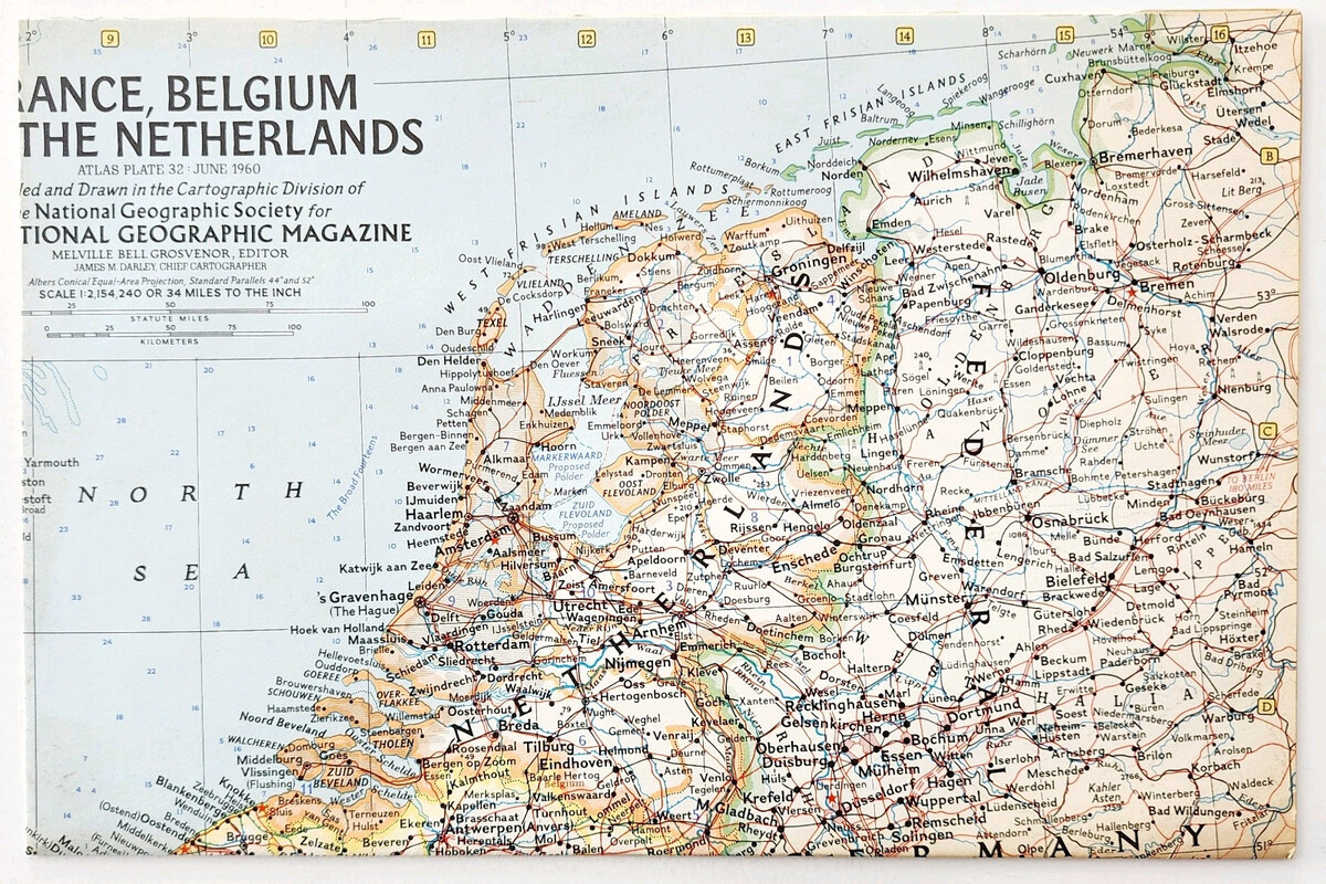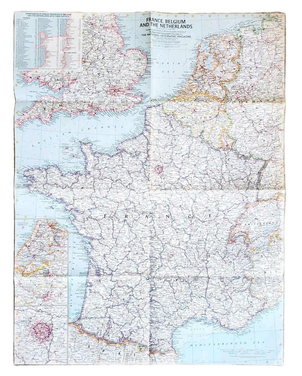 - 1960 France Belgium Netherlands Map National Geographic Europe 24.5 x 19" E6A