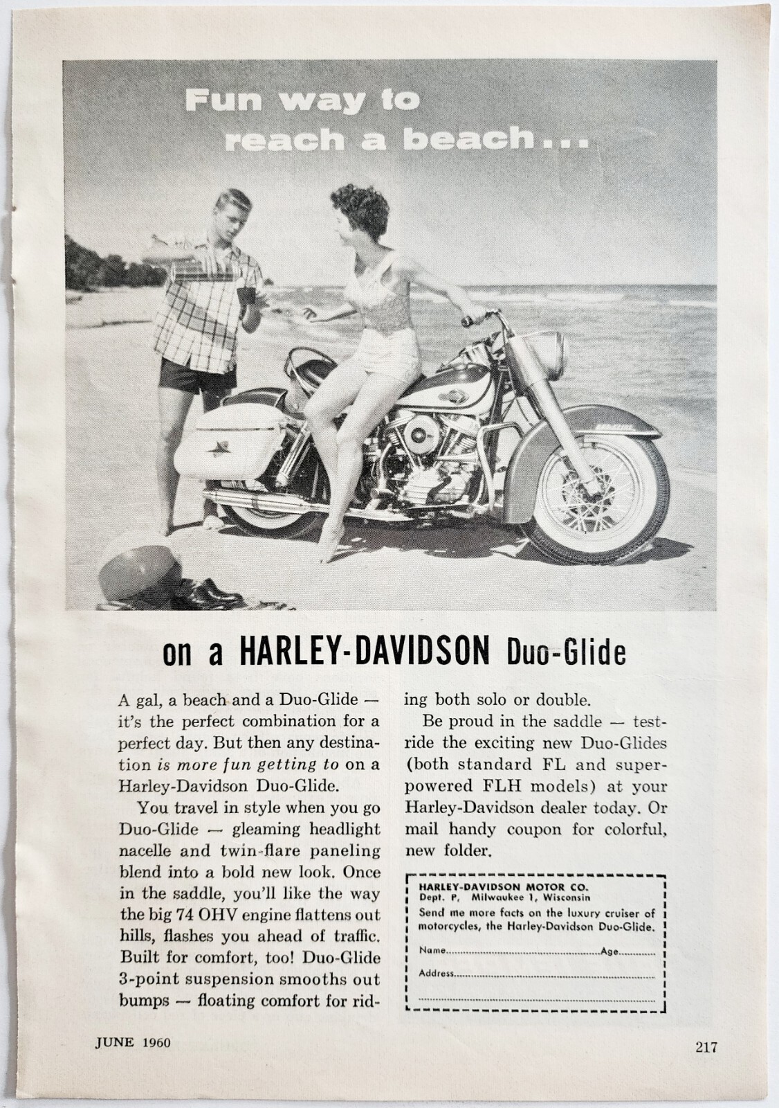 - 1960 Harley Davidson Motorcycle Advertisement Duo-Glide Beach Vintage DWF25