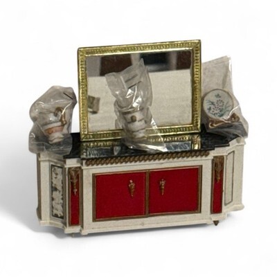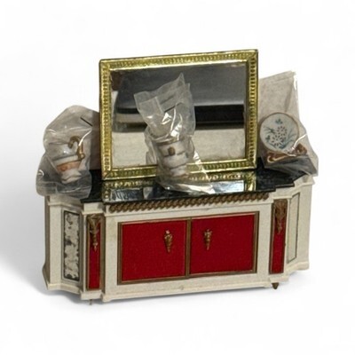Royal Buffet. Marble Finish Top. Cupboard Doors Open and Close. Complete with one mirror, picture plate and two Porcelain Vases.