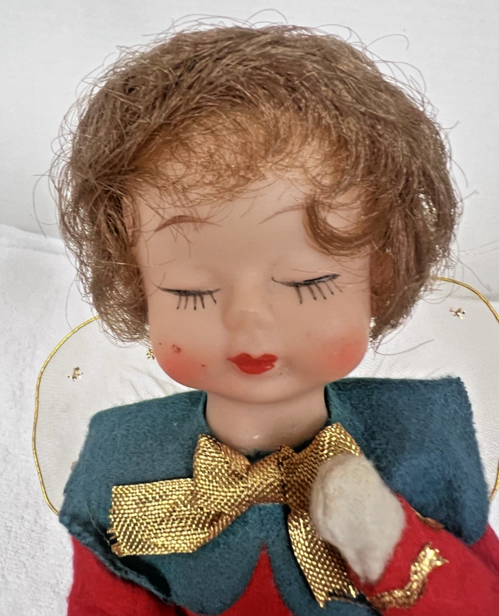 1960s Christmas Brunette Angle w Net Wings Bendable Knees 10 3/4 inch long the way the knees are bent... In great shape very clean the cheeks have extra tiny red dots?