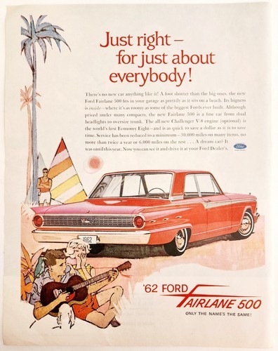 - 1961 62 Ford Fairlane 500 Advertisement Automobilia Beach Couple Guitar HM2P