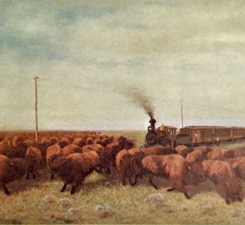 - 1961 Buffalo Herd Blocking Railway Train Railroad Print Card Antique Litho DWO5