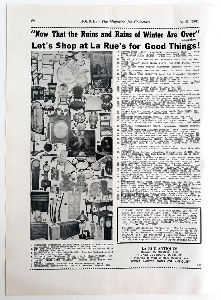 - 1961 La Rue's Antiques Shop Advertisement Highland Ohio Vintage Retail DWV10