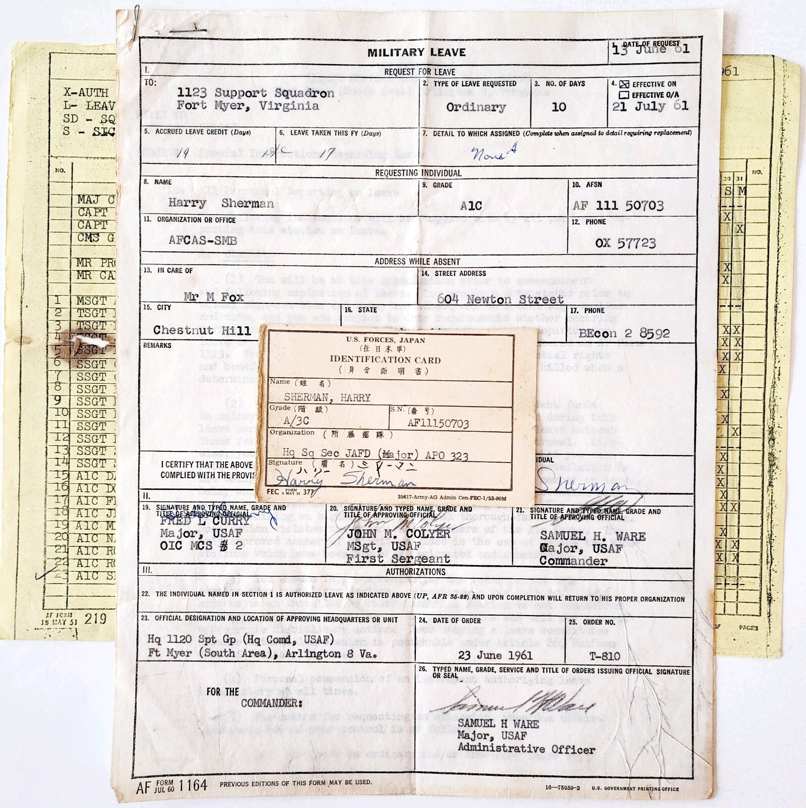 1961 Military Leave ID Card Lot Harry Sherman US Forces Japan Vietnam Era DWRR3
