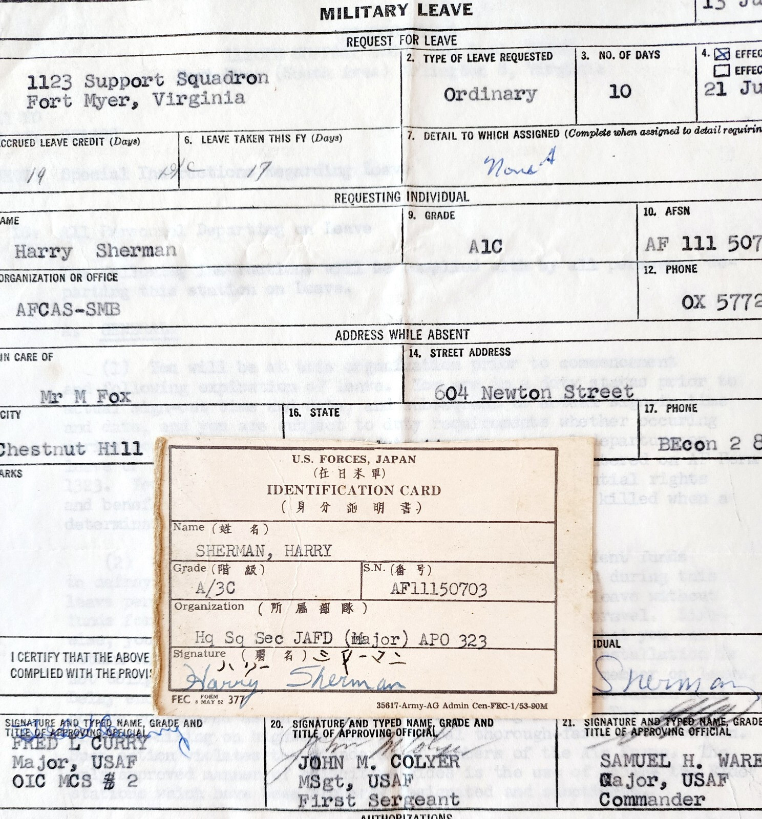 - 1961 Military Leave ID Card Lot Harry Sherman US Forces Japan Vietnam Era DWRR3