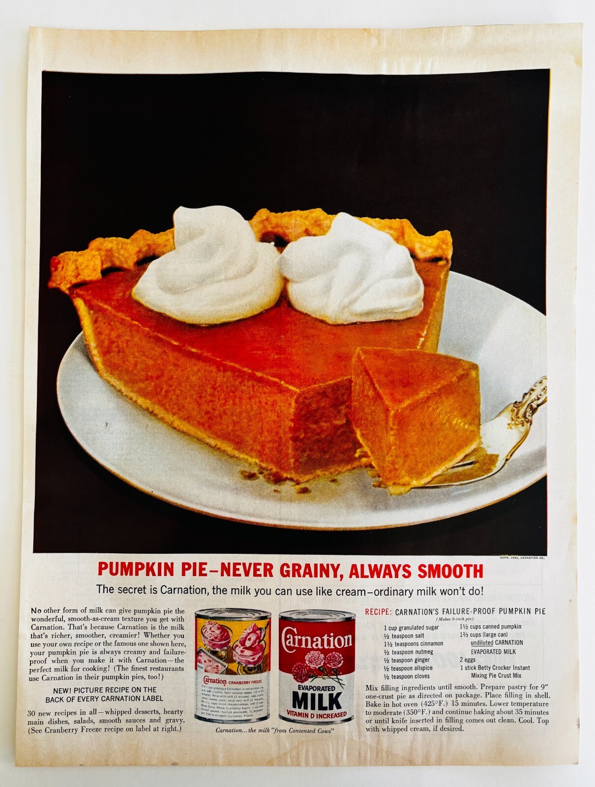 - 1963 Carnation Evaporated Milk Dairy Advertisement Pumpkin Pie Recipe DWJJ17