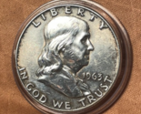 The 1963 Franklin P Sue Half Dollar is a circulated coin made of 90% silver. Minted in Philadelphia, this coin features the profile of Benjamin Franklin on the obverse and various symbols representing the United States on the reverse. Uncertified and in AU grade, this piece of US currency encapsulates the historical significance and numismatic value of a bygone era.