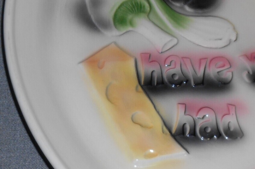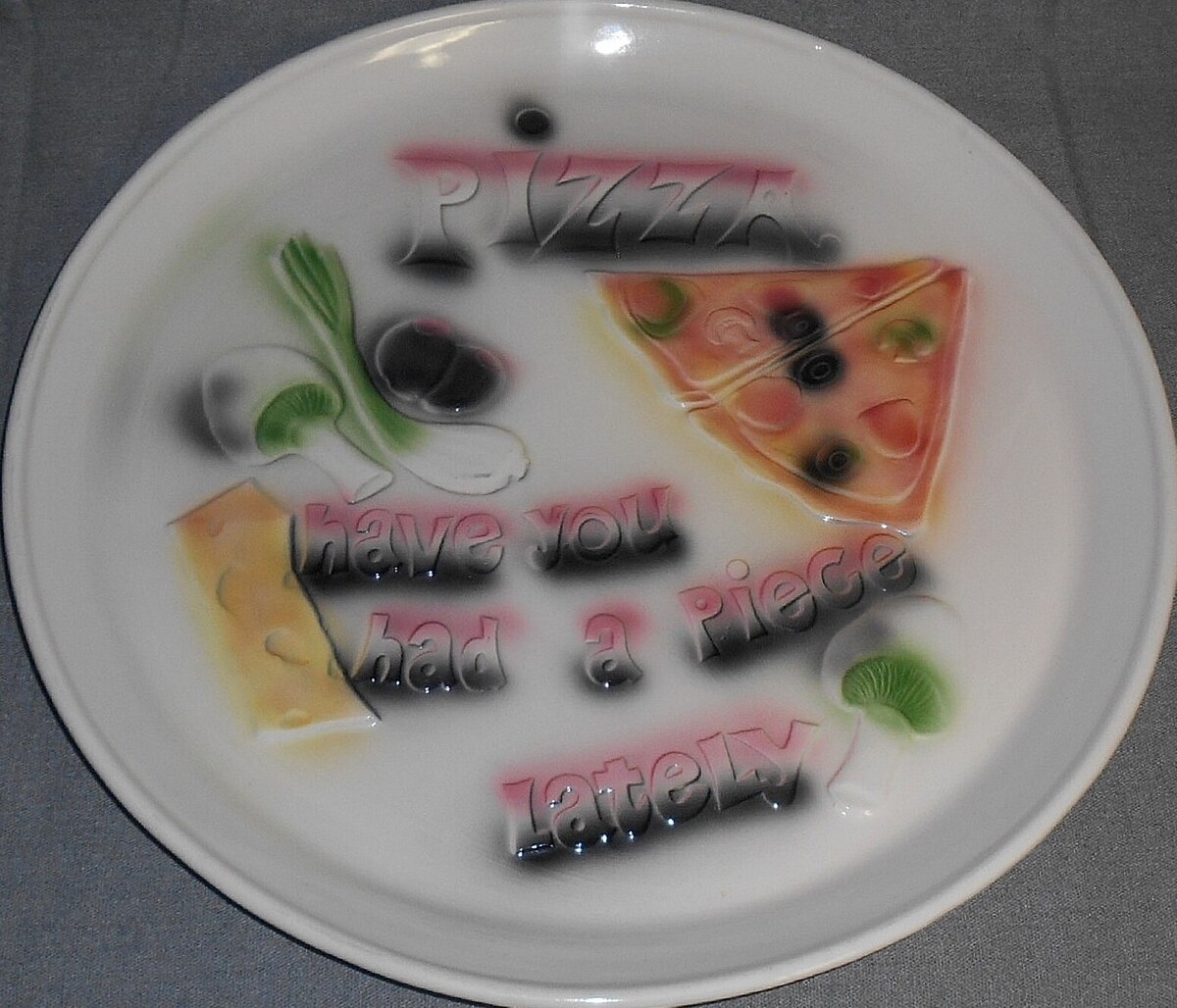 This is a great 15 1/2" Round Pottery or Ceramic Pizza Tray that has embossed graphics and reads "PIZZA - Have You Had A Piece Lately" from Marcia of California and dated 1963. It is in great pre-owed condition with no chips or cracks and perfect for either use or display.