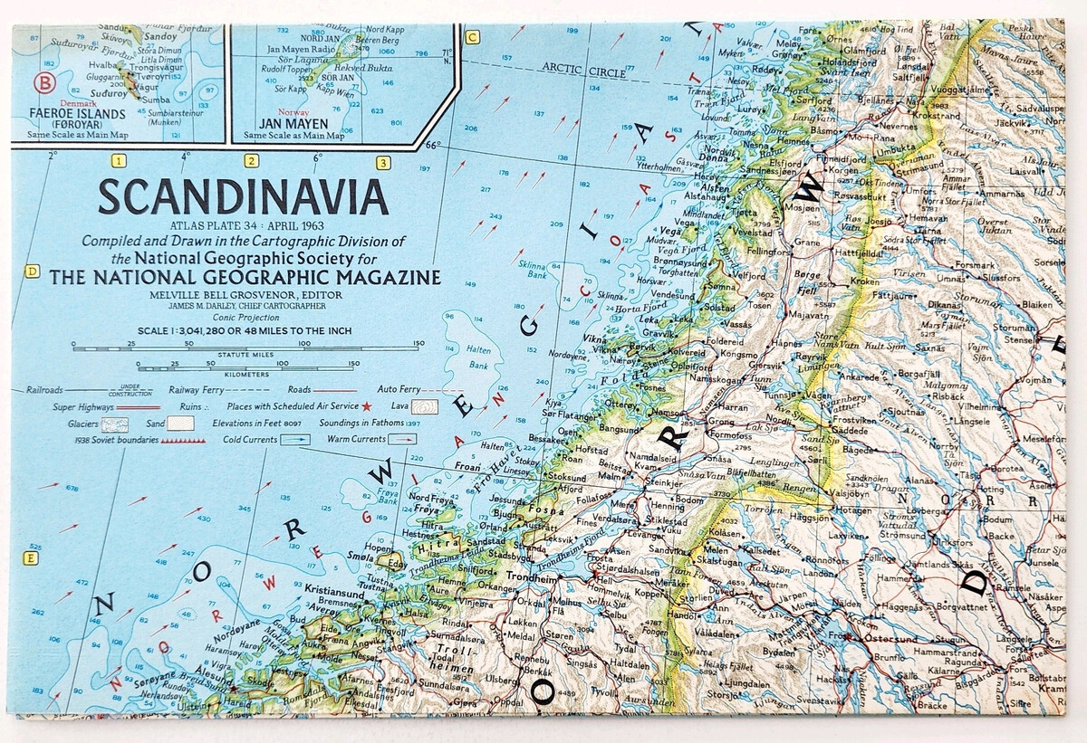 1963 Scandinavia Map National Geographic Norway Sweden Finland 24.5 x 19" E6A