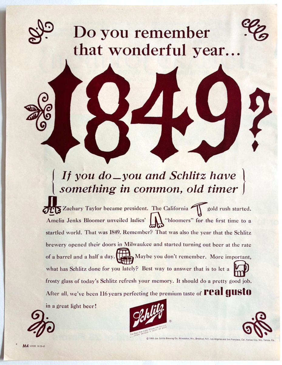 - 1965 Schlitz Beer Milwaukee Advertisement Vintage Brewery 1849 Founded DWYY1