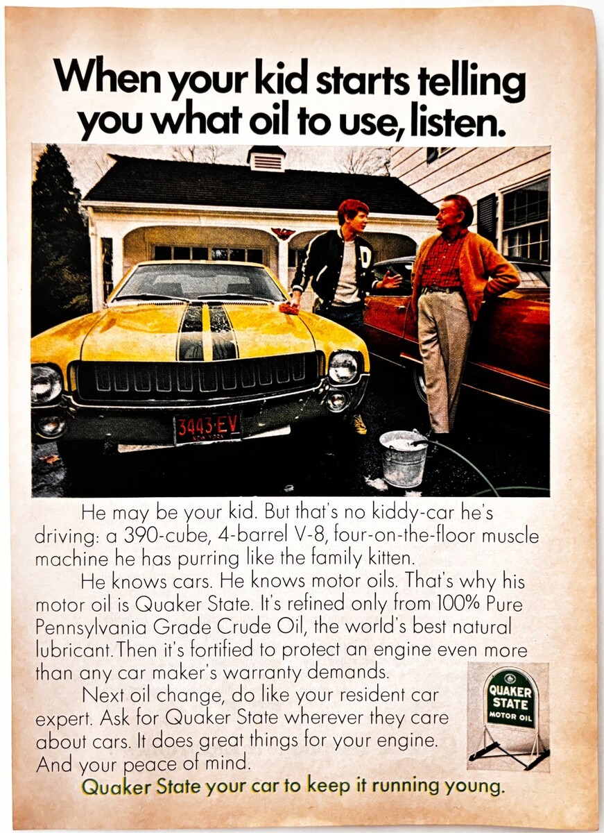 - 1970 Quaker State Motor Oil Advertisement Vintage Automobilia Penn Crude F15Q