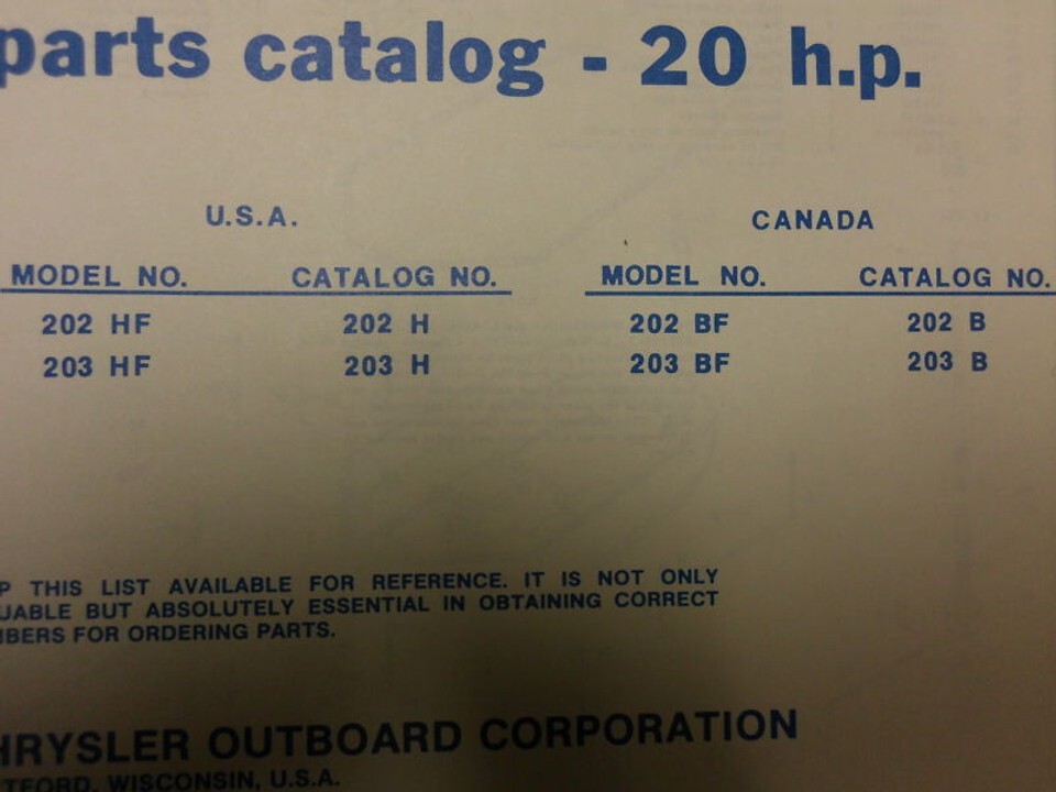Un catalogue Chrysler Outboard 20 HP 1973. Pour les modeles 202 HF, 203 HF.