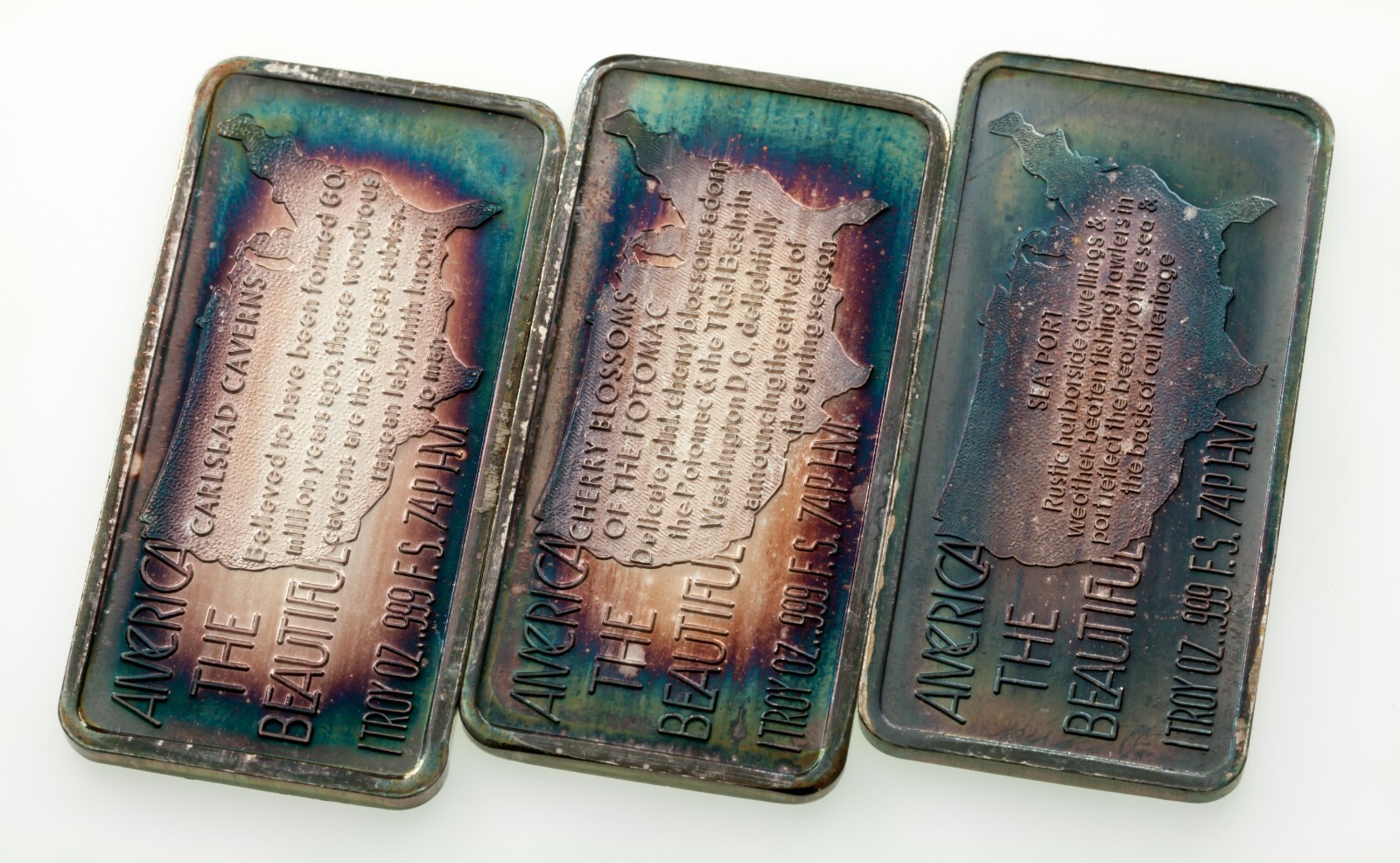 1974 Hamilton Mint America The Beautiful 1 oz Silver Art Bars Lotto di 3 lingotti