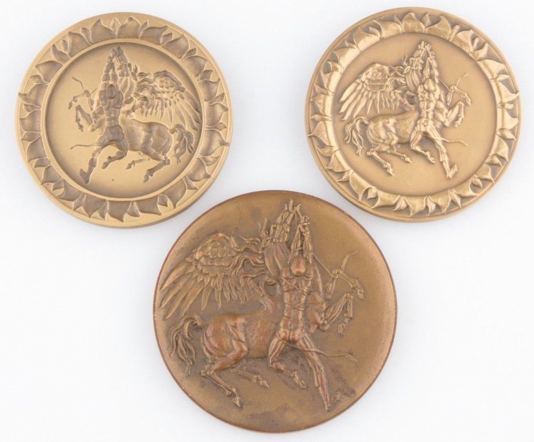 Obverse has the same image as the interior of the 2-part medal: Man harnessing Pegasus