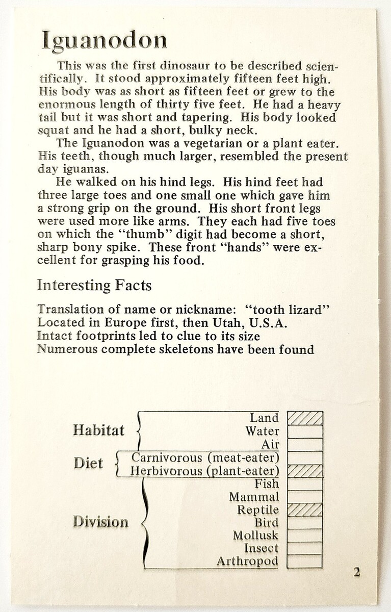 - 1975 IGUANODON Dinosaur Card Vintage Prehistoric Illustration Ephemera B78A
