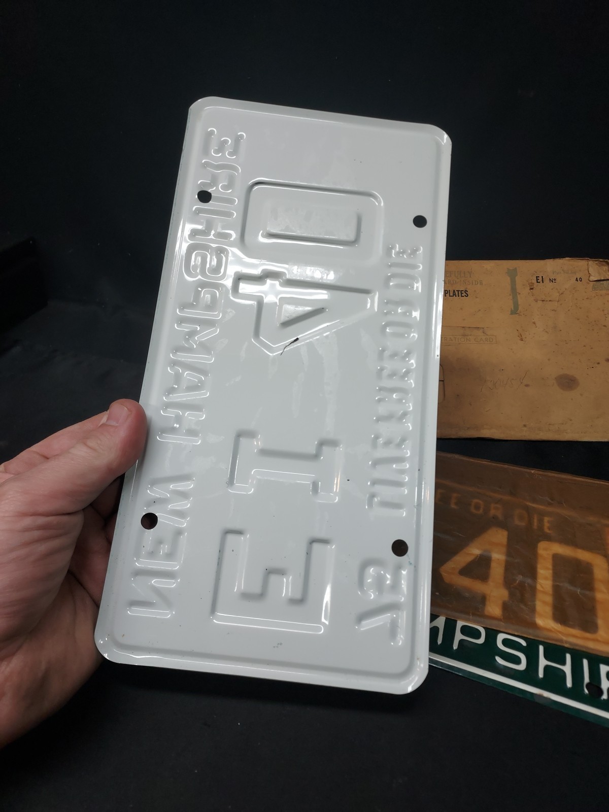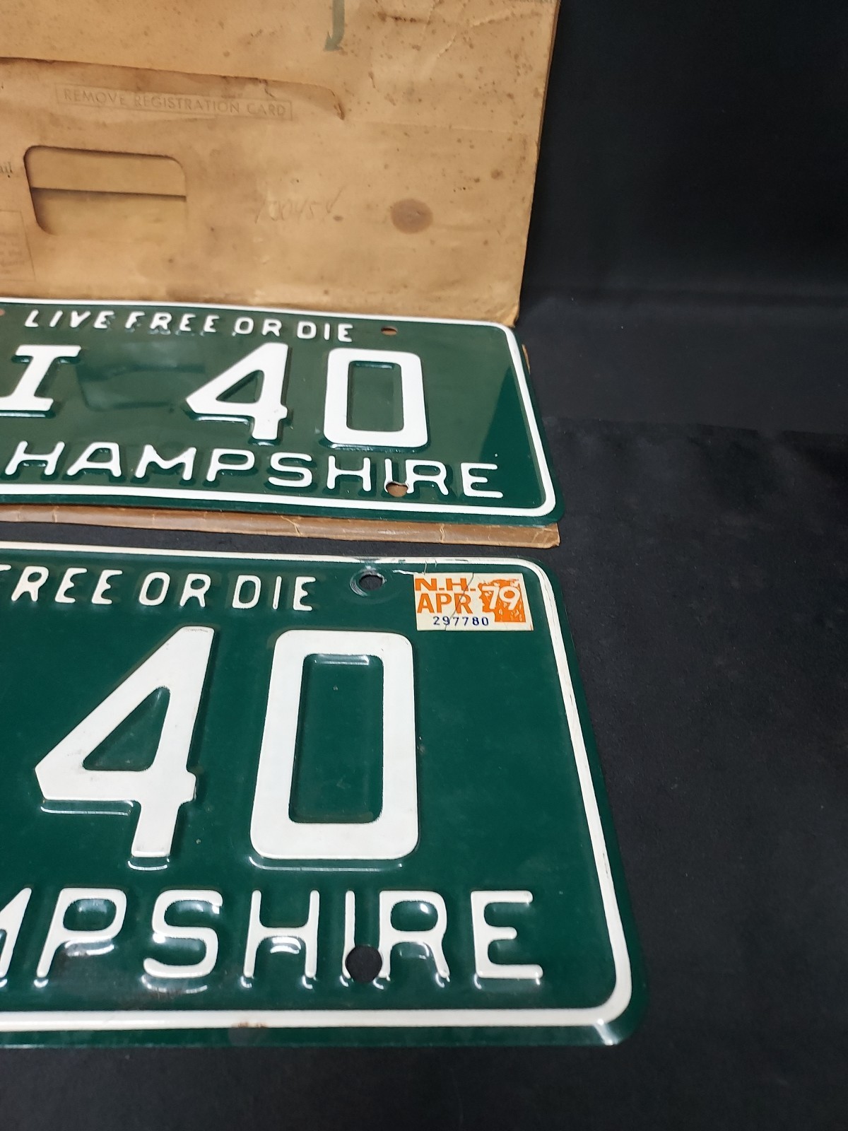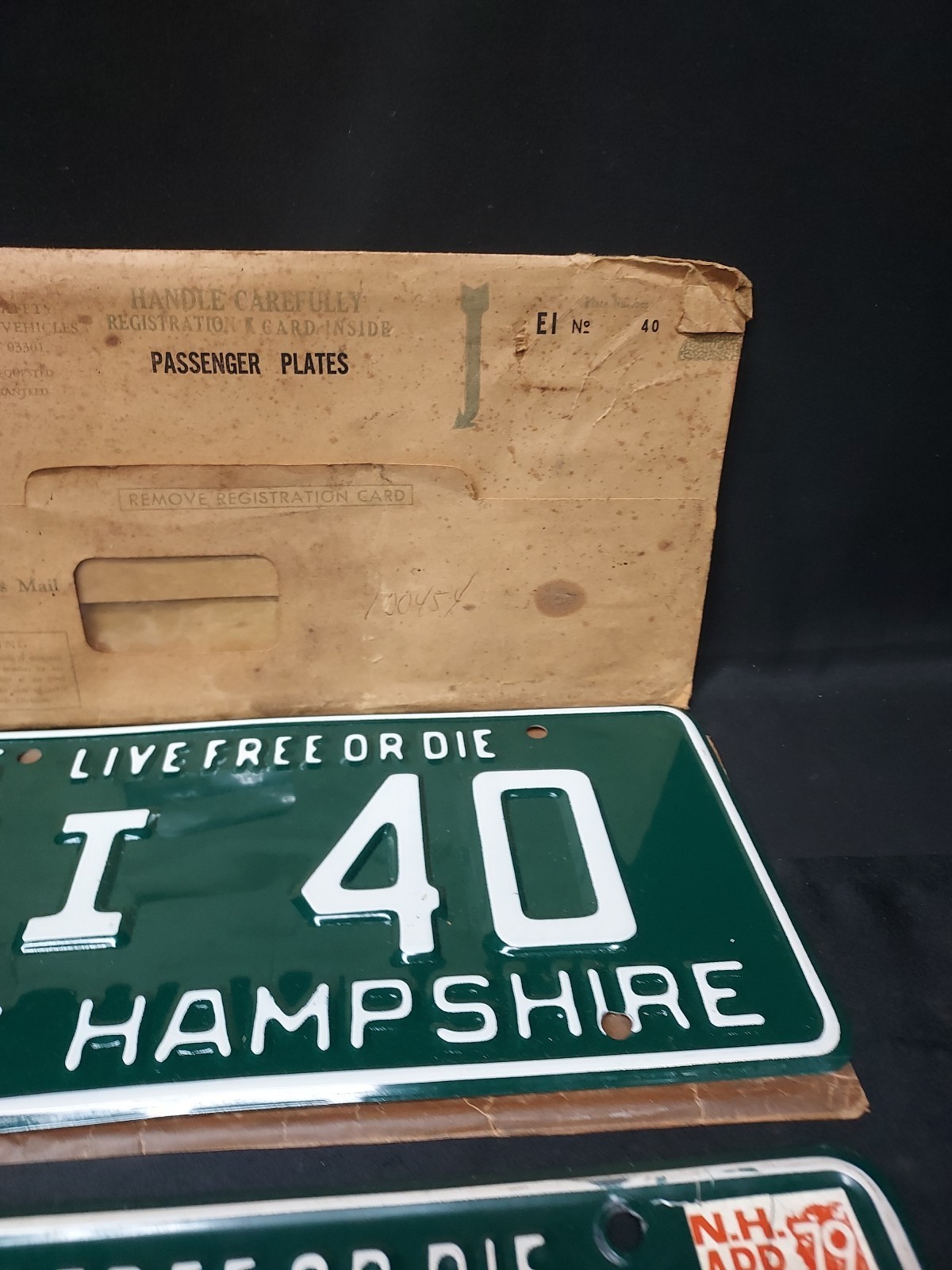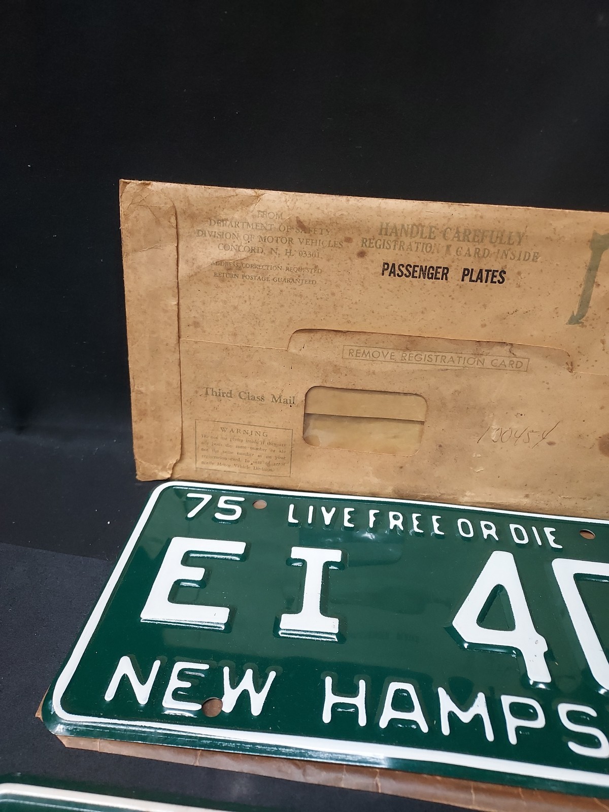 1975 New Hampshire License Plate Tags Set EI 40 - Low 2 Digit Number W/ Envelope
