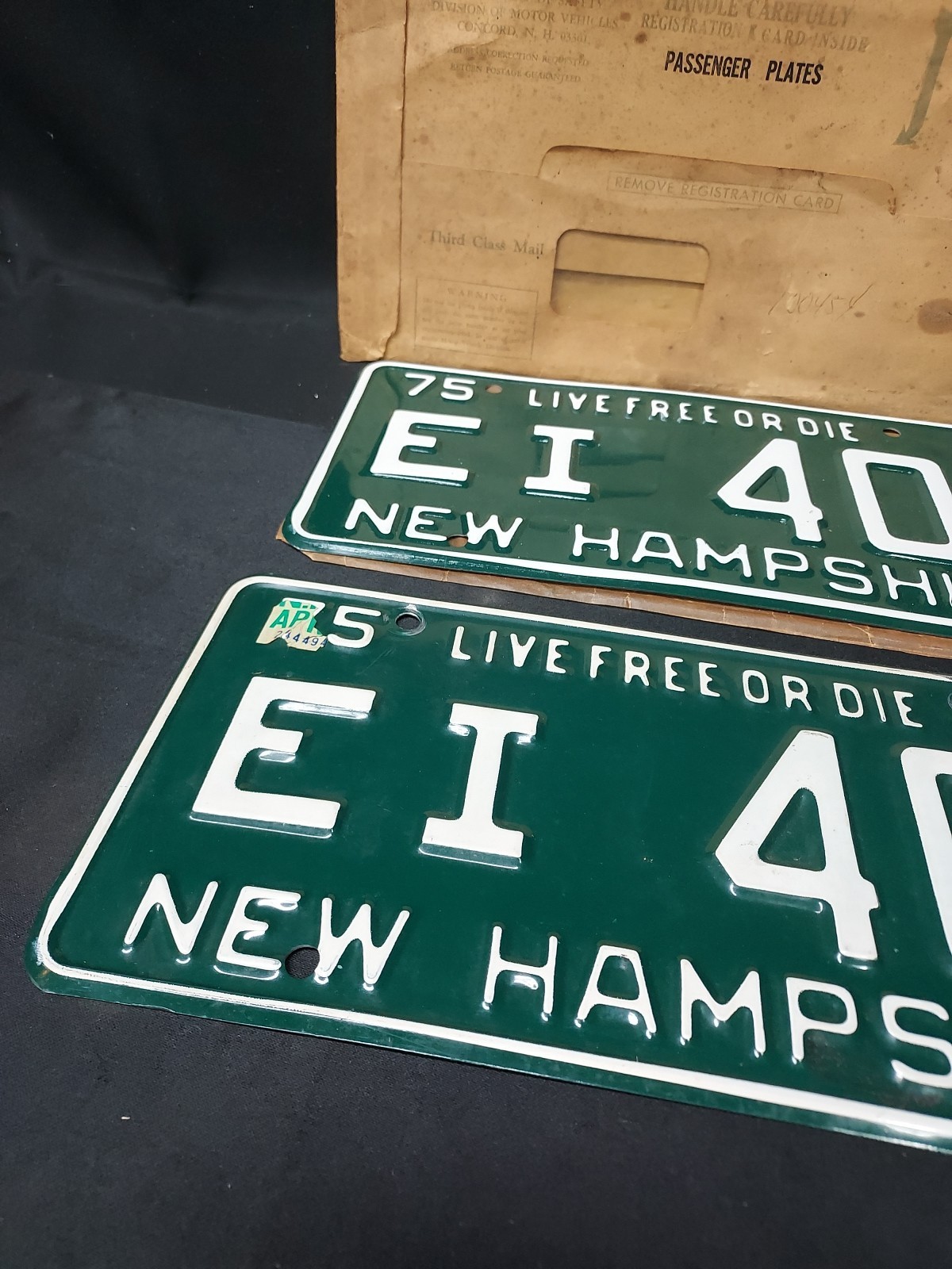 - 1975 New Hampshire License Plate Tags Set EI 40 - Low 2 Digit Number W/ Envelope