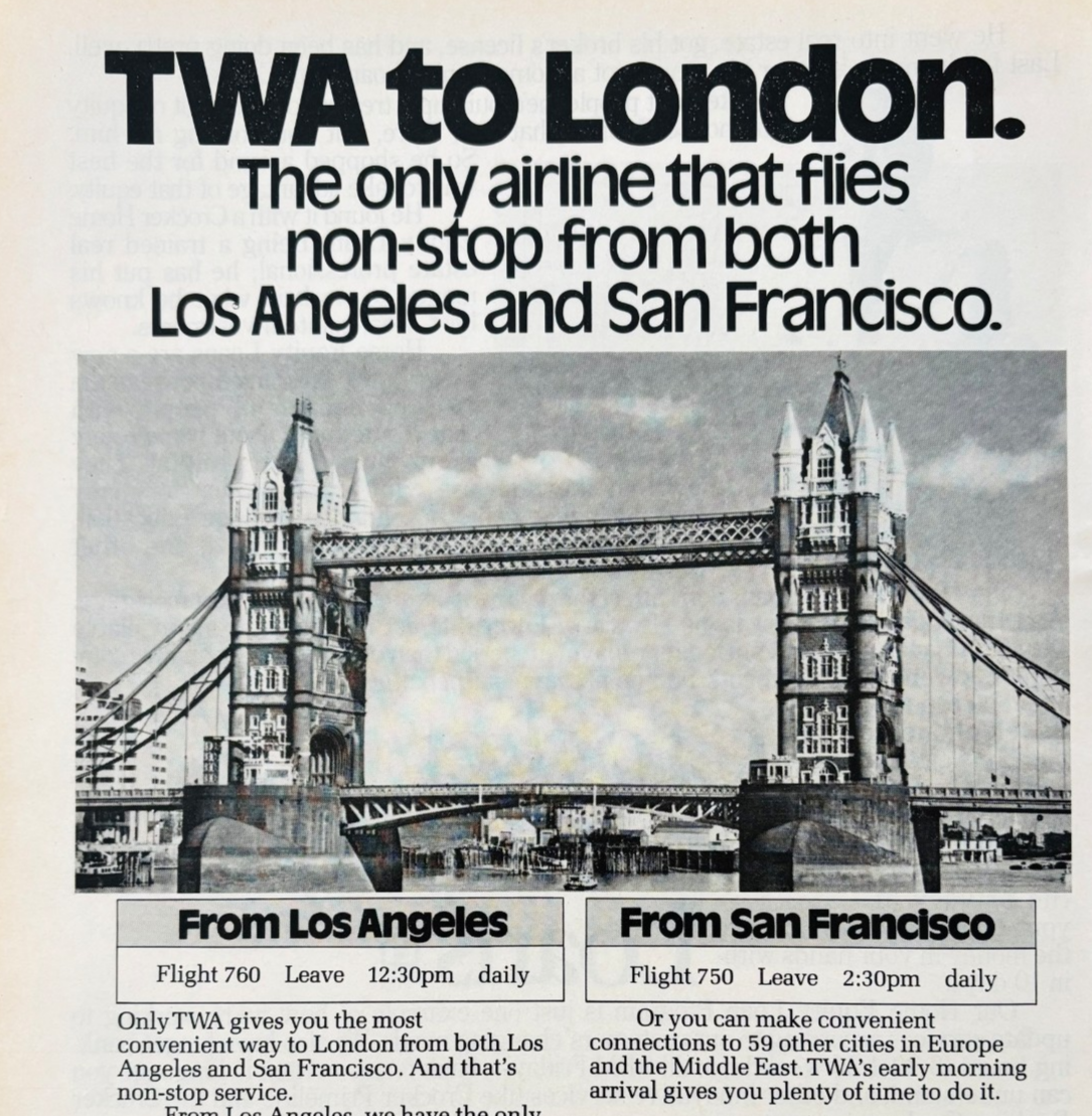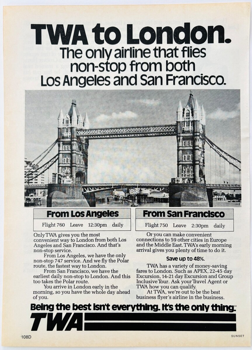 1977 TWA Airlines Advertisement Vintage London England Travel Aviation DWW13C