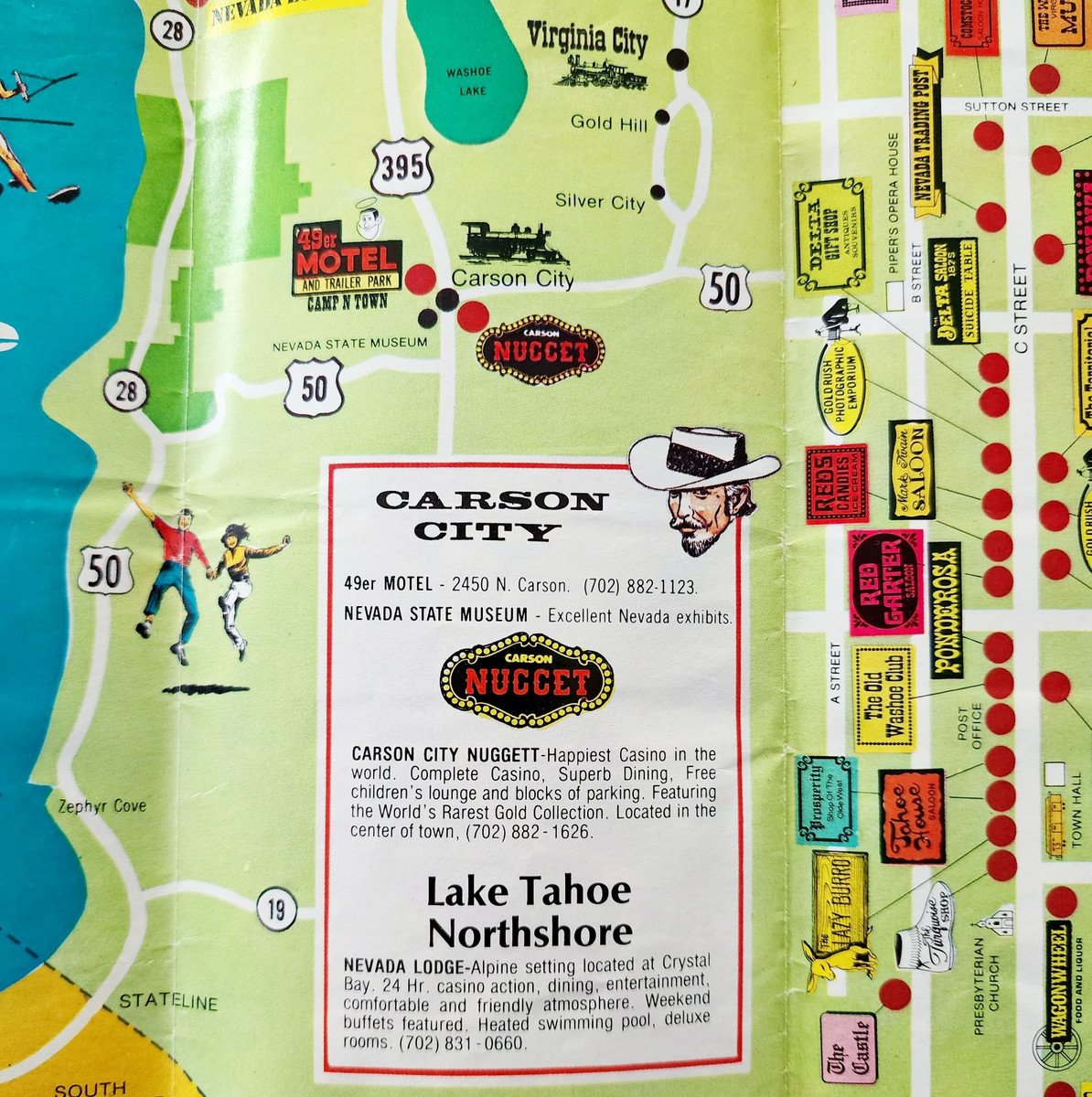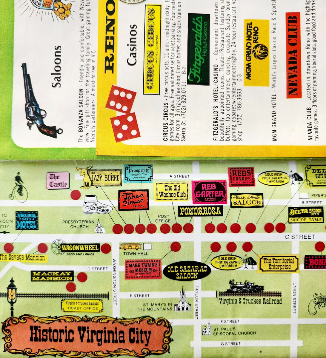 - 1980 Reno Nevada Map Fun Tour Guide 2 Sided Viginia City Sparks Tahoe Vtg E98B