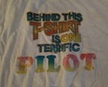Up for sale is a 1980's "Behind this T-Shirt is One Terrific Pilot" N6059Q Glitter Iron-on Blue 50/50 Sportswear. Shirt is stained on left shoulder and on stomach.