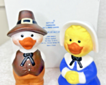 They seem to be never used perfect for the Thanksgiving table this year Mr. and Mrs. Pilgrim duck from Susie's zoo made a bisque porcelain they?ve never been used. He stands 4 1/4 inches tall