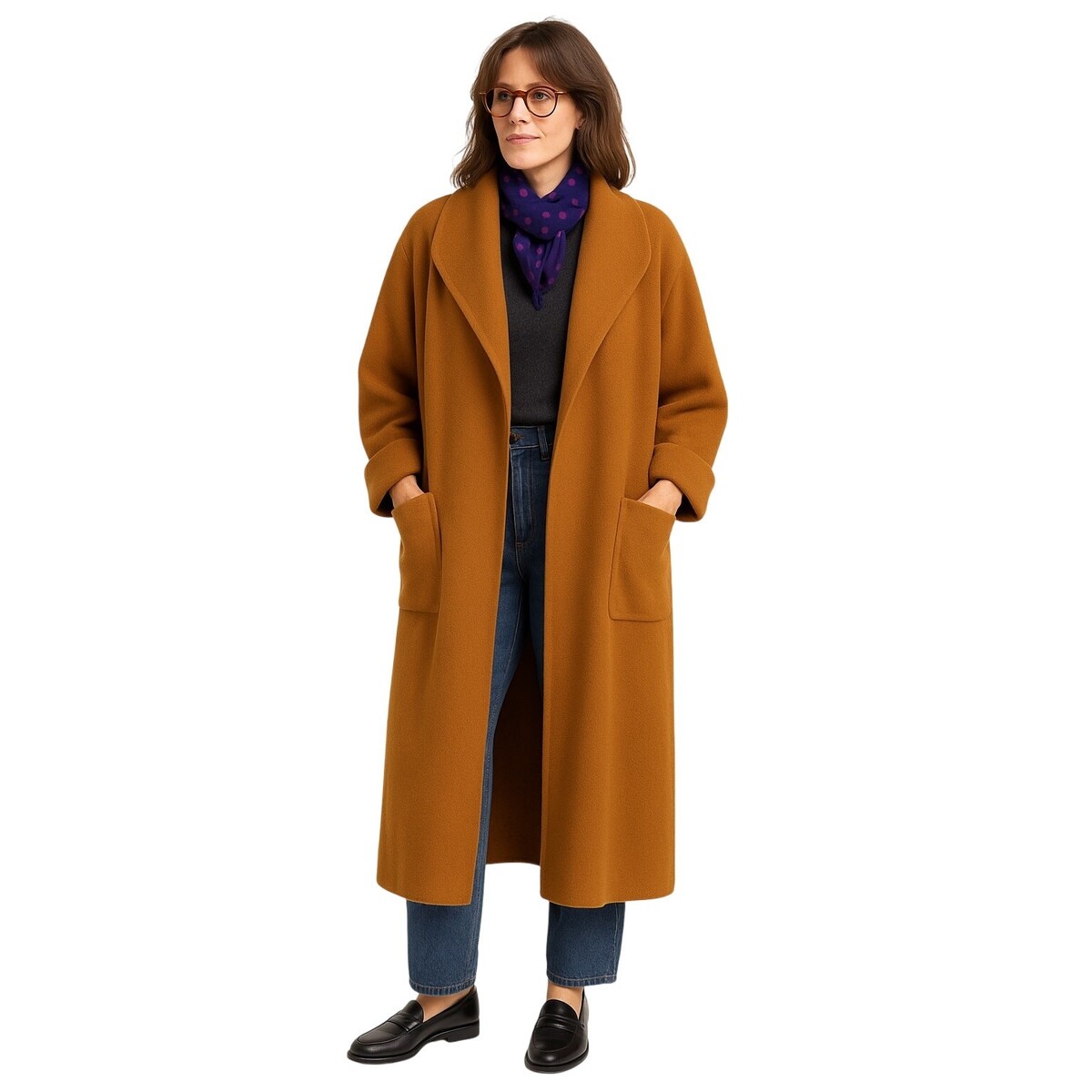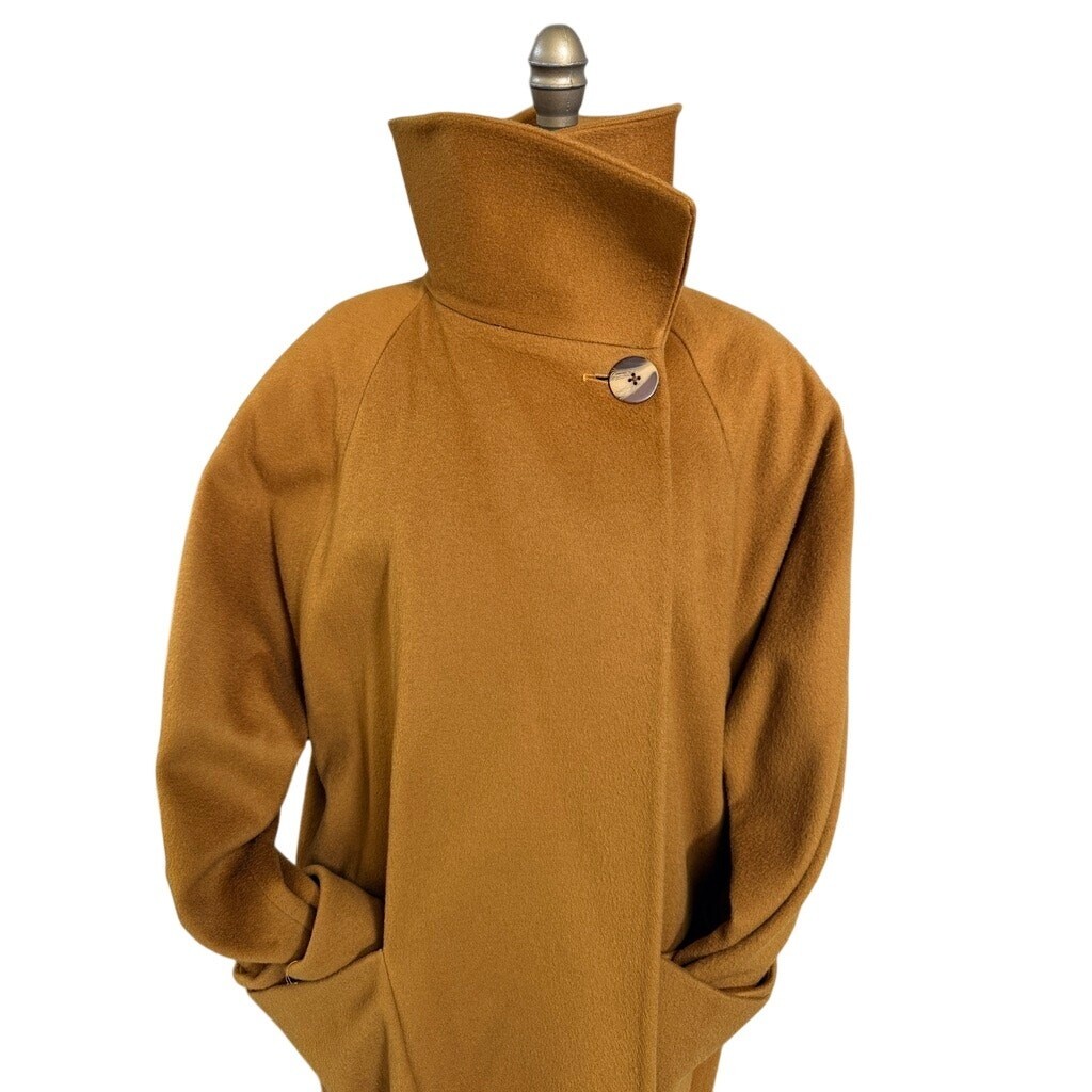Vintage 1980s Christian Dior coat in a gorgeous fall shade. Crafted in superfine lambswool by Ing. Loro Piana, Italy, known for world-class fabrics. Features oversized patch pockets, a convertible neckline, and a slouchy, tailored cut that epitomizes late-70s into 80s power dressing. Marked size 6, shown on a size 6 mannequin.