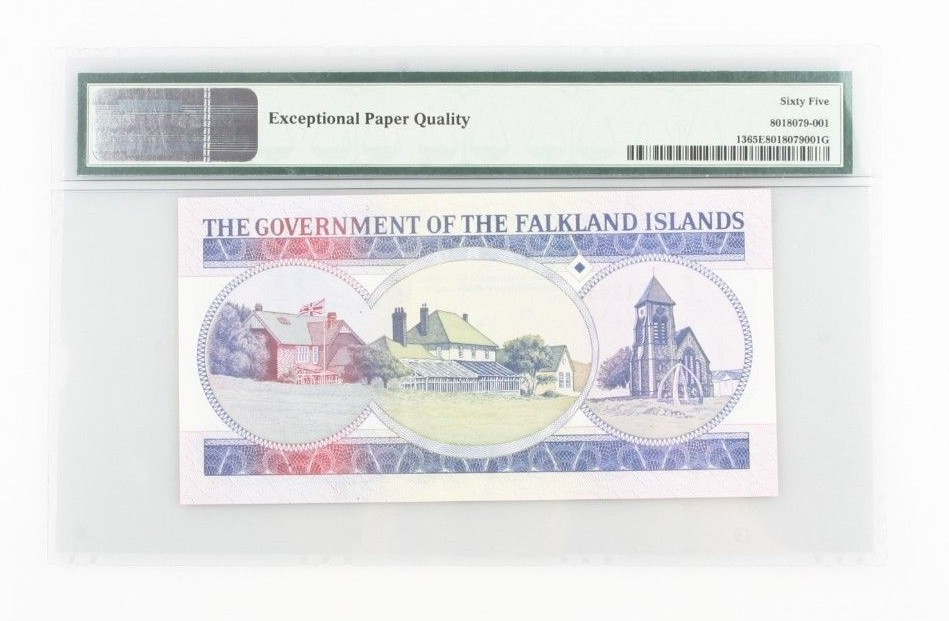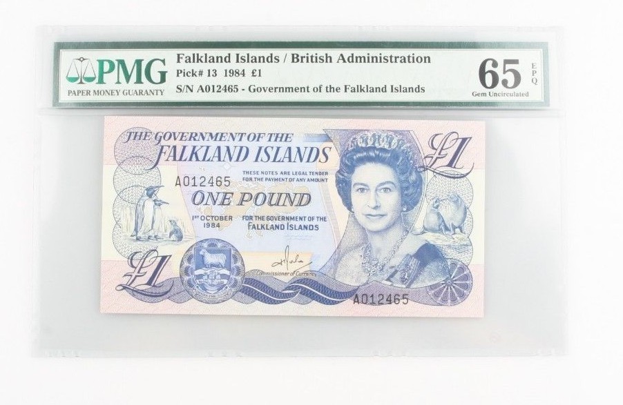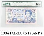 Sealed in a PMG holder with the title "Falkland Islands / British Administration // Pick# 12 1984 1 // S/N A012465 - Government of the Falkland islands"