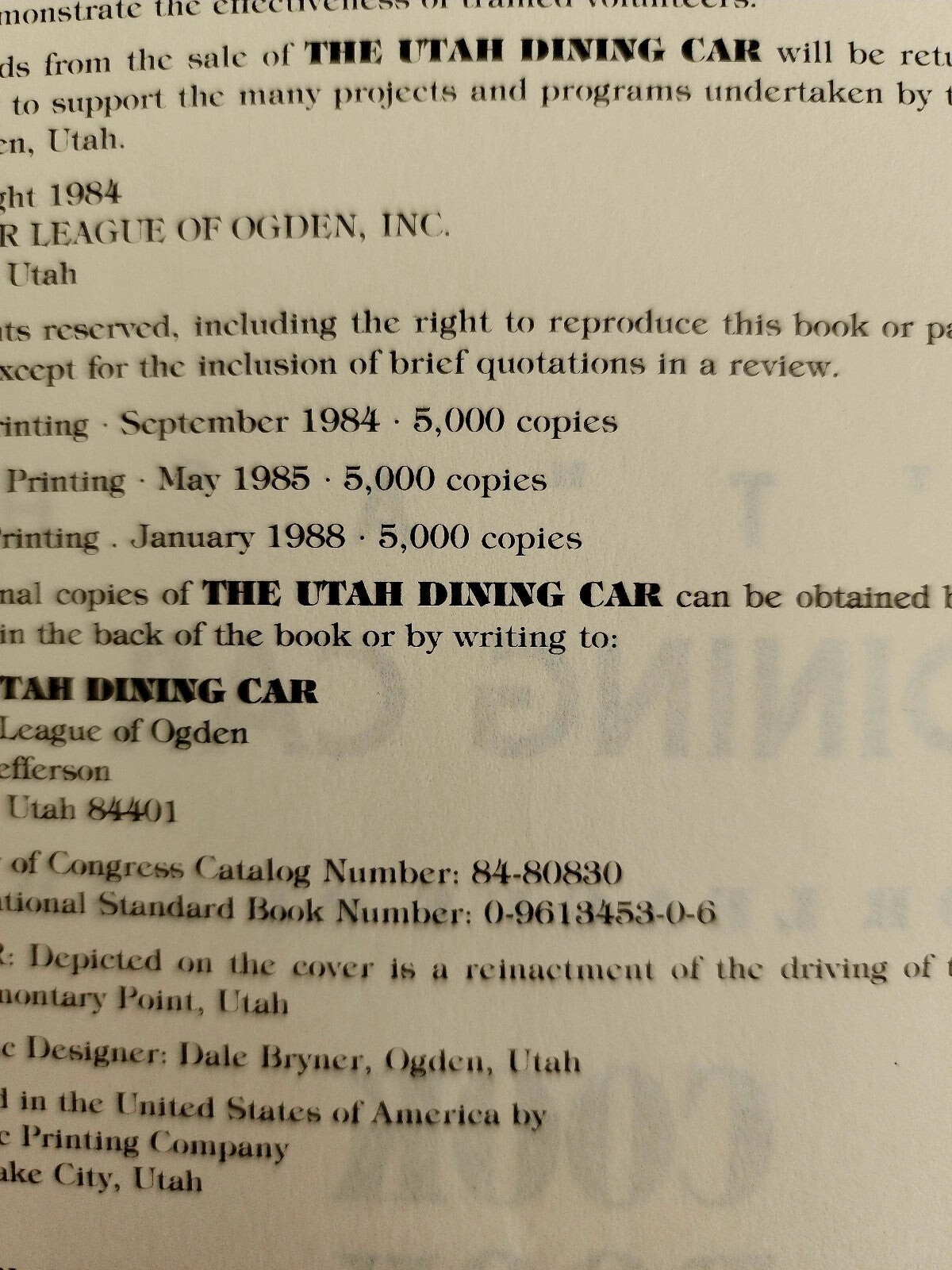 - 1984 Rare Utah Dining Car Railroad History Cookbook League of Ogden 1 of 15,000