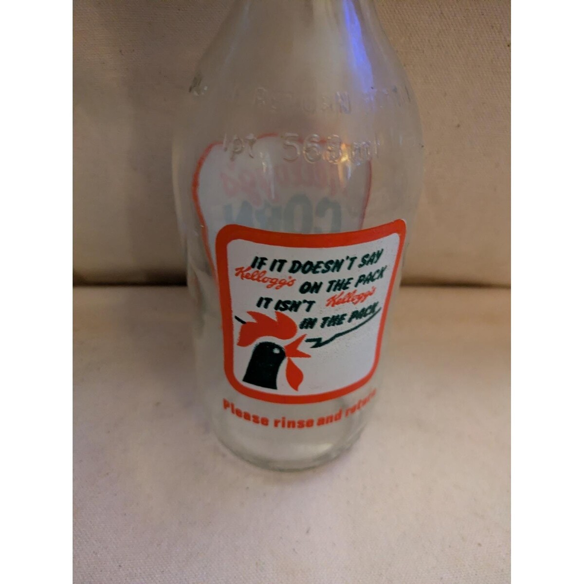 Relive breakfast nostalgia with this charming vintage Kellogg's Corn Flakes glass milk bottle. This collectible bottle showcases the iconic Kellogg's Corn Flakes branding with a cheerful rooster graphic and the memorable slogan 'The Original and Best.' The reverse side features the important message 'If it doesn't say Kellogg's on the pack it isn't Kellogg's in the pack' and a reminder to 'Please rinse and return.' This bottle is a fantastic piece for collectors or a delightful decorative accent for your kitchen or breakfast nook. Perfect for a retro kitchen display or as a unique gift for a cereal enthusiast. Keywords: cereal bottle, glass bottle, advertising collectible, retro kitchen, breakfast decor, vintage advertising, corn flakes, collector's item, kitchenware, display piec