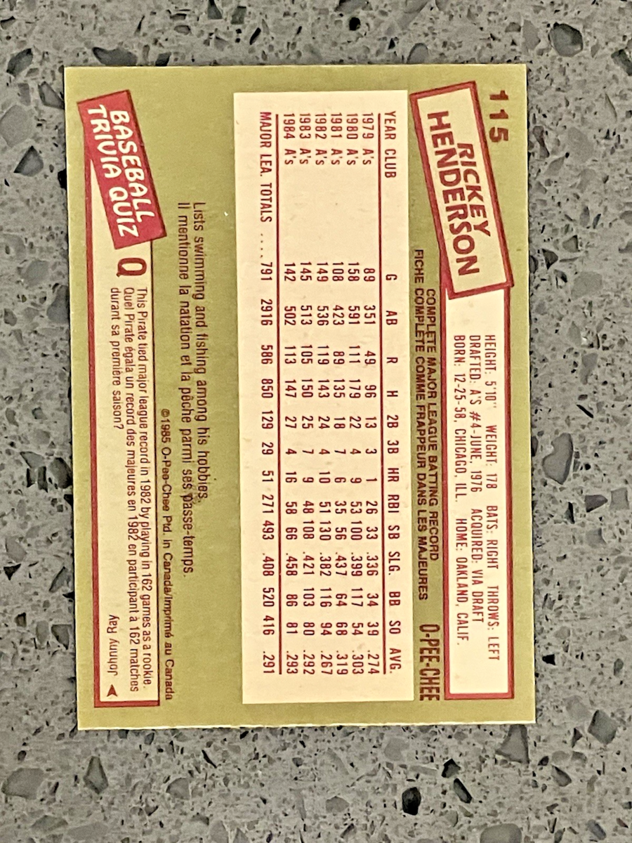 1985 O-Pee-Chee Rickey Henderson #115 1st Yankees Card - 90% Rarer Than Topps C