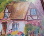 This is a charming painting of a picturesque cottage nestled in a lush green landscape. The cottage is white with a thatched roof, and features a quaint front door with a flower box and a small window. A wooden fence with a gate leads up to the cottage, and there is a path lined with colorful flowers. The surrounding countryside is idyllic, with rolling hills, lush trees, and a clear blue sky.