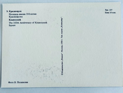 - 1988 Russian Postcard Krasnoyarsk Square 350th Anniversary Cold War E86RP1