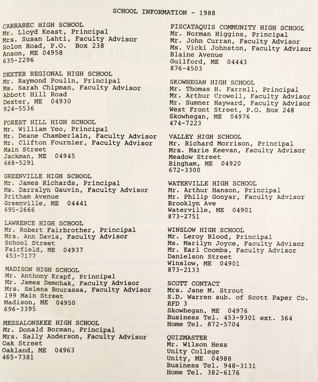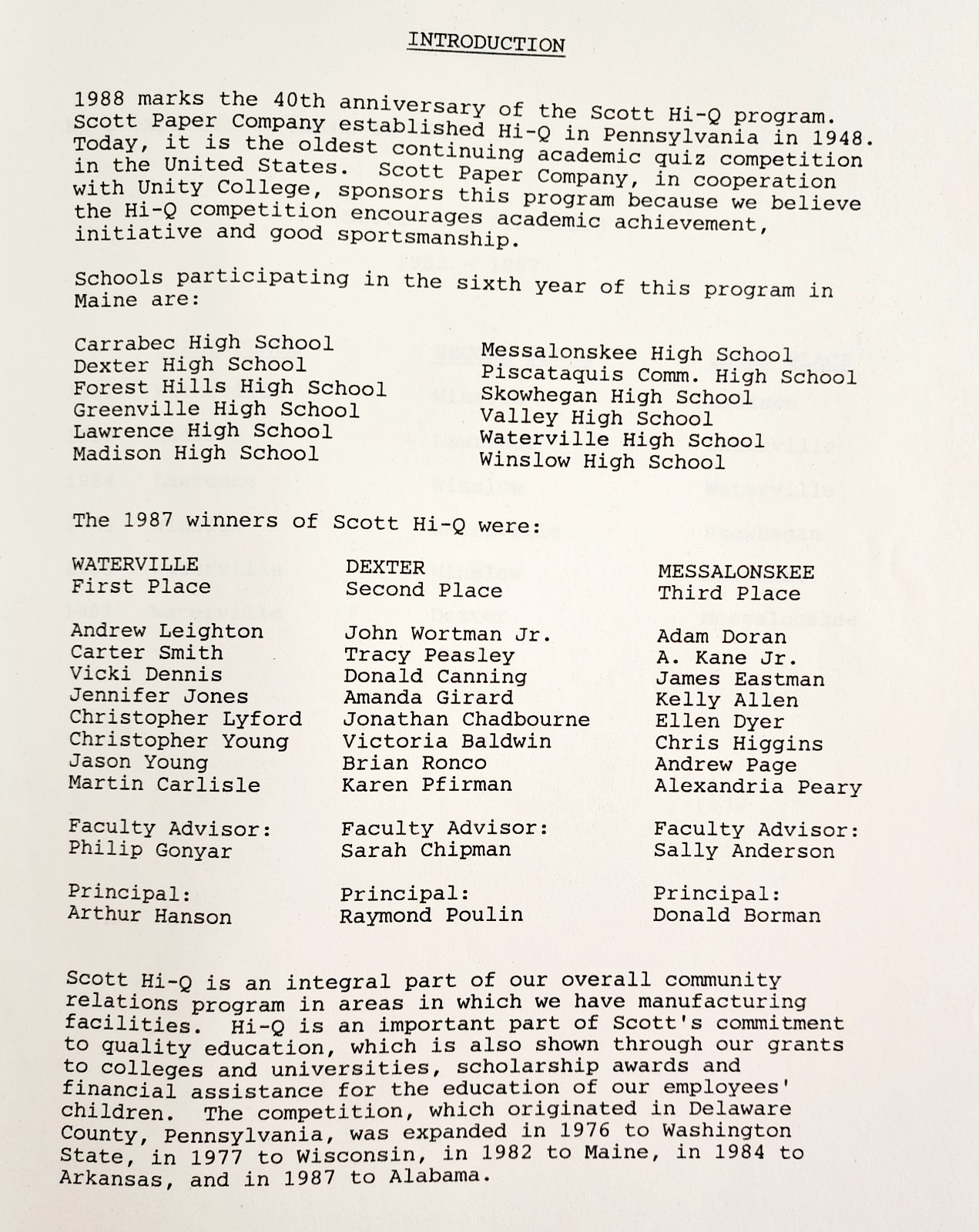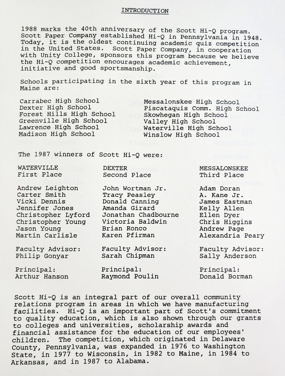 1988 Scott Paper Company Hi-Q Quiz Competition Program 40th Anniversary F15R