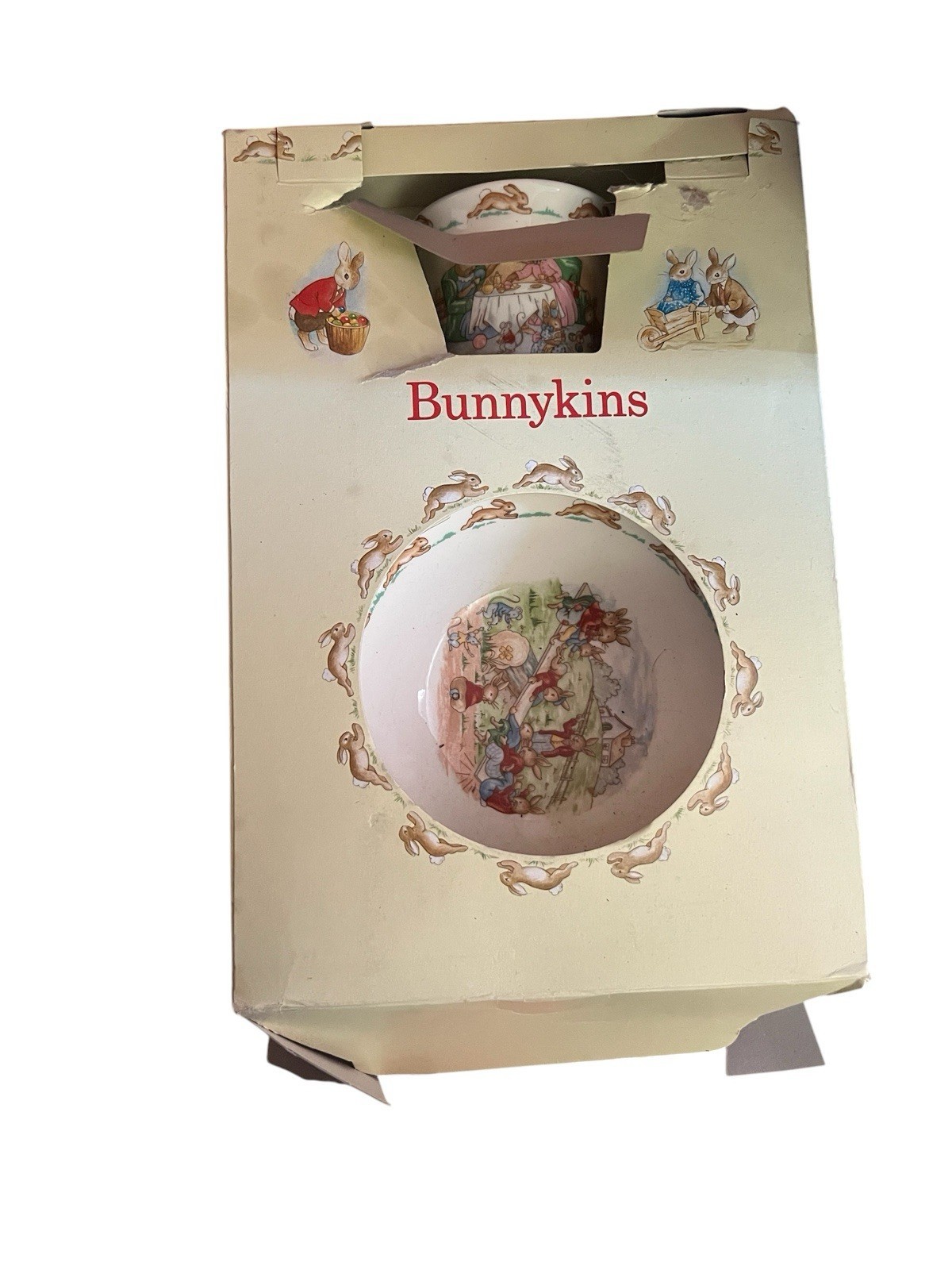 - 1989 Royal Doulton Bunnykins Childrens 3 Piece Set Bowl, Mug, Plate Ugly Box