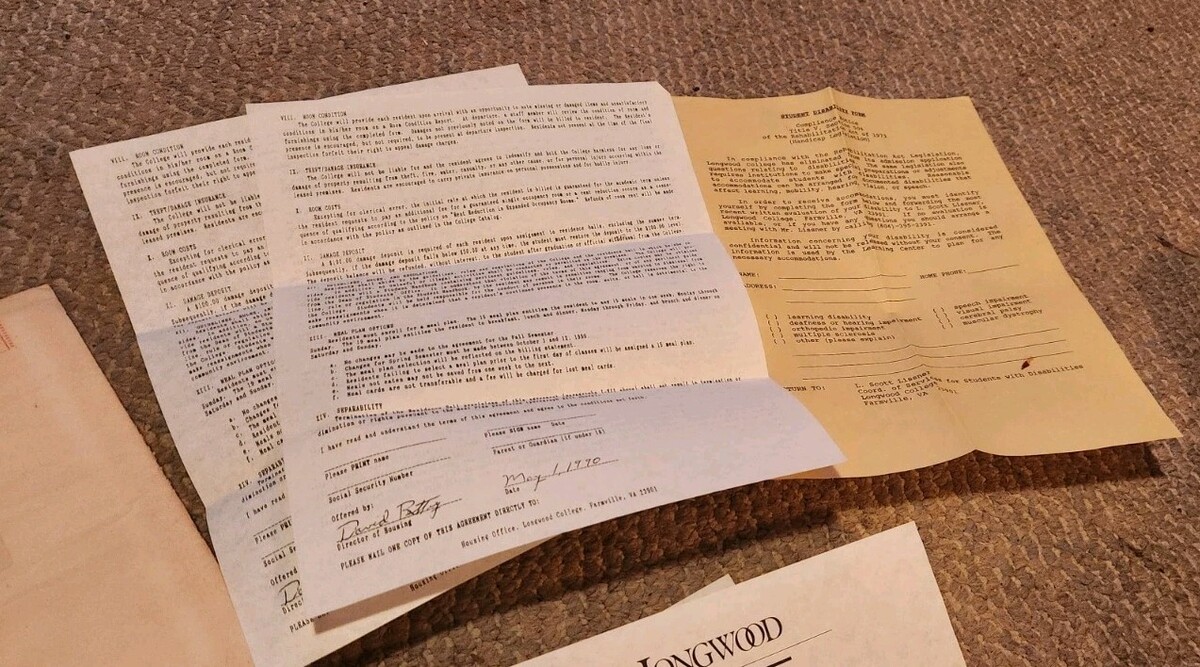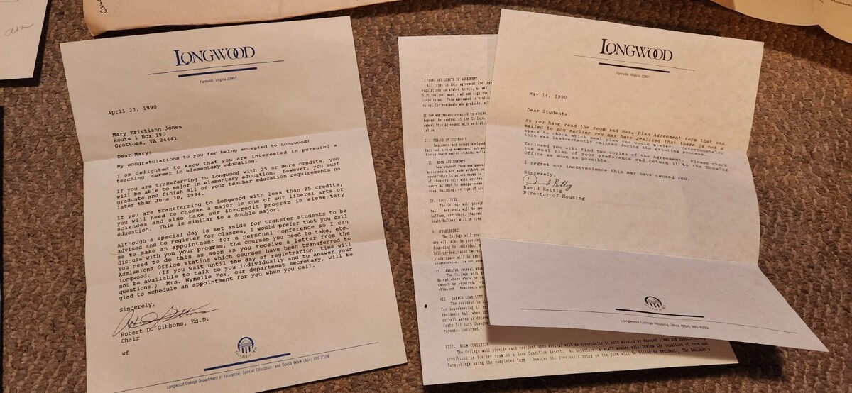 Good letters from Longwood College. Acceptance letter. Meal Hall plan letter. Booklet. Letterhead, envelope etc.