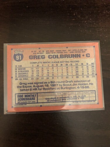 1991 Greg Colbrunn Rookie Topps 40 Years of Baseball #91 Montreal Expos . Condition is Used. Shipped with Standard Envelope for Trading Cards, Stamps, Postcards Coins up to $20.