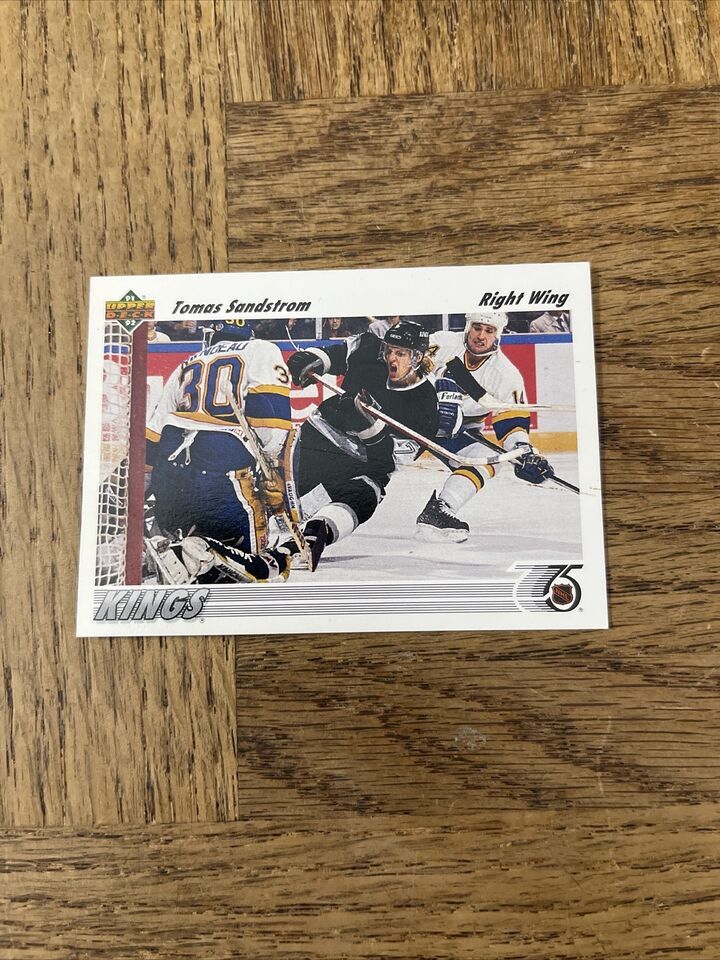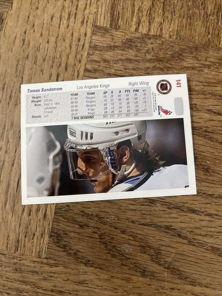 This 1991 UD Thomas Sandstrom Card #141 is perfect for any ice hockey fan. It features Sandstrom in an action shot, with vibrant colors that make it stand out. This sports trading card is from the National Hockey League (NHL) and is an excellent addition to any sports trading card collection.