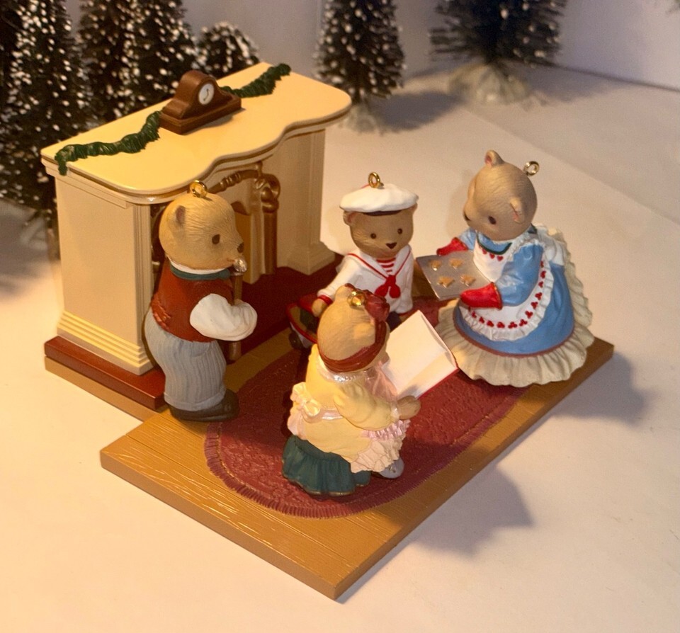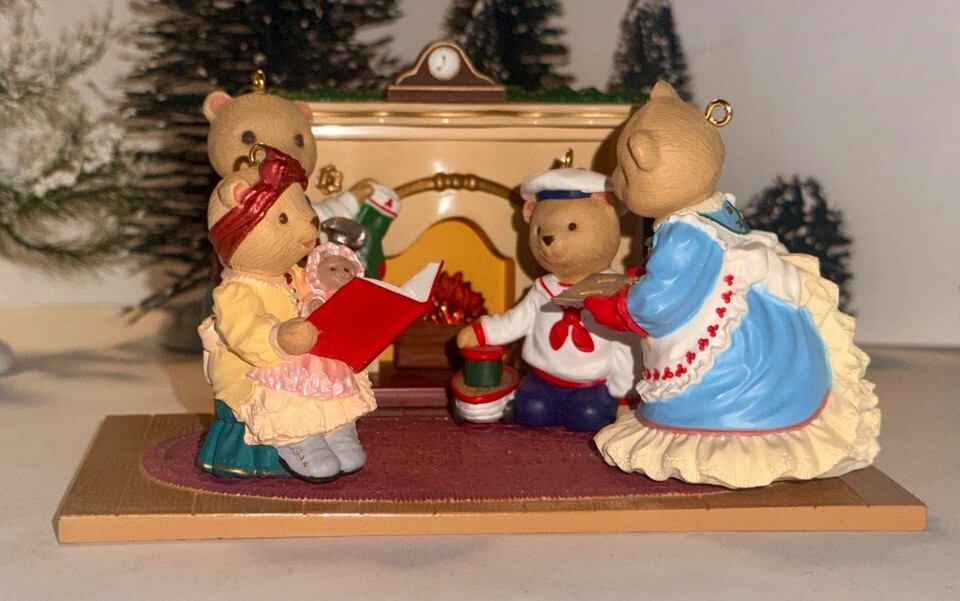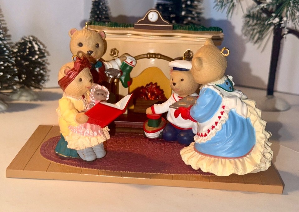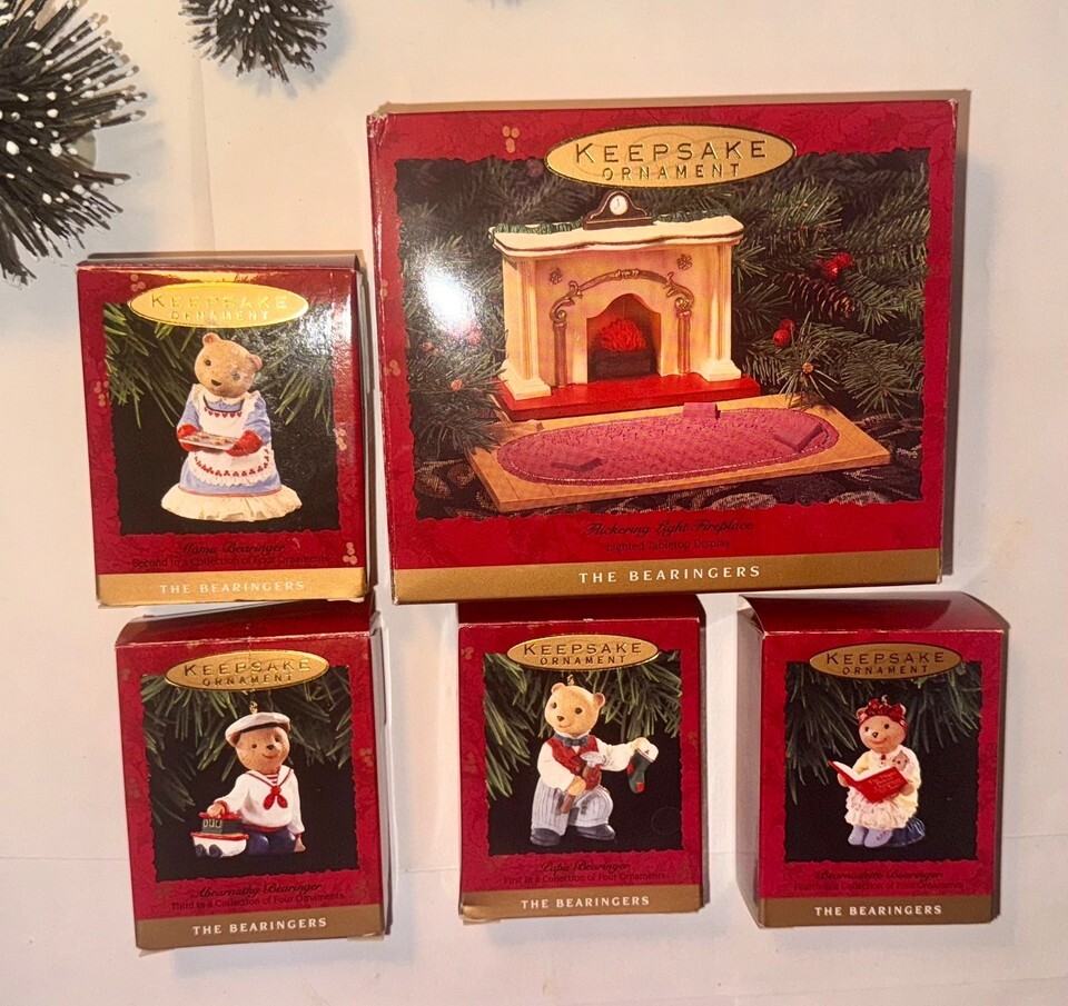 You are bidding on a set of four Bearingers bear ornaments and the Flickering Light Fireplace they can be posed around when not hanging in the tree. The collection was created by Hallmark in 1993 as a collection of Keepsake Ornaments and the two-piece fireplace were all sold separately.